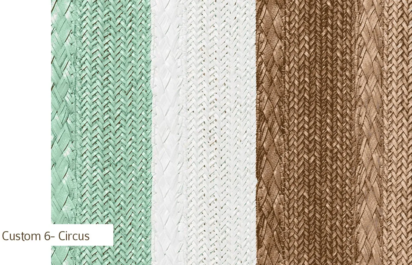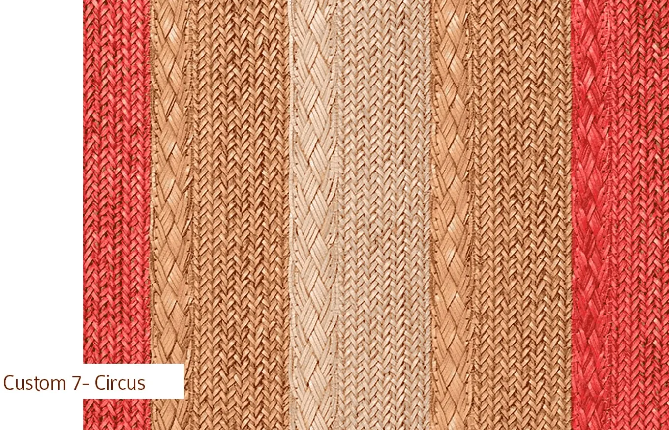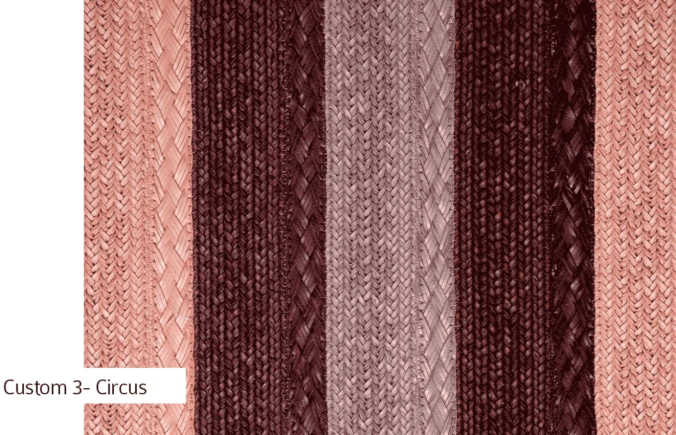 La alfombra Circus es 100% personalizable. Puede elegir entre dos tamaños diferentes de trenzas y una gran selección de colores. Las diferentes combinaciones y las repeticiones de trenzas formarán diferentes alfombras de líneas, rayas y bloques de colores.