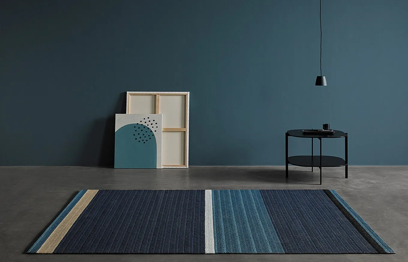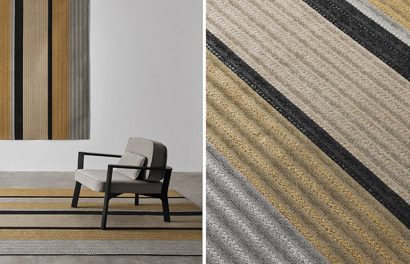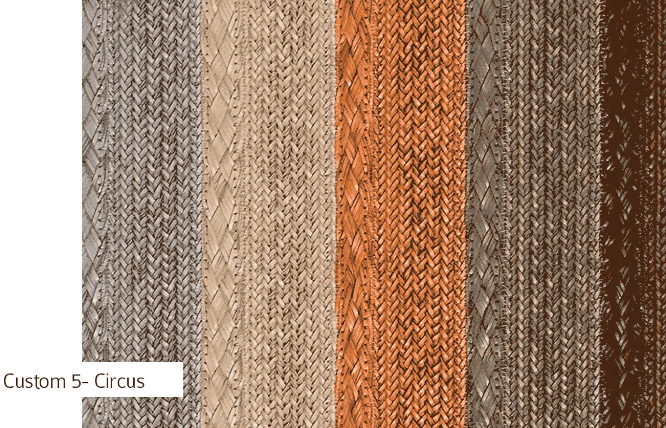 La alfombra Circus es 100% personalizable. Puede elegir entre dos tamaños diferentes de trenzas y una gran selección de colores. Las diferentes combinaciones y las repeticiones de trenzas formarán diferentes alfombras de líneas, rayas y bloques de colores.