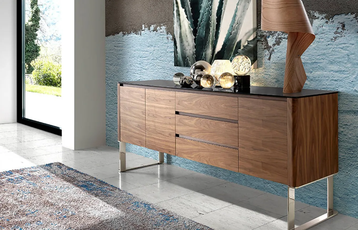 - Aparador de Nogal con sobre de cristal templado negro.
