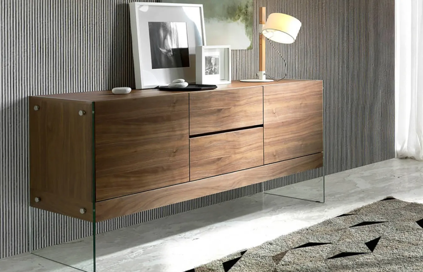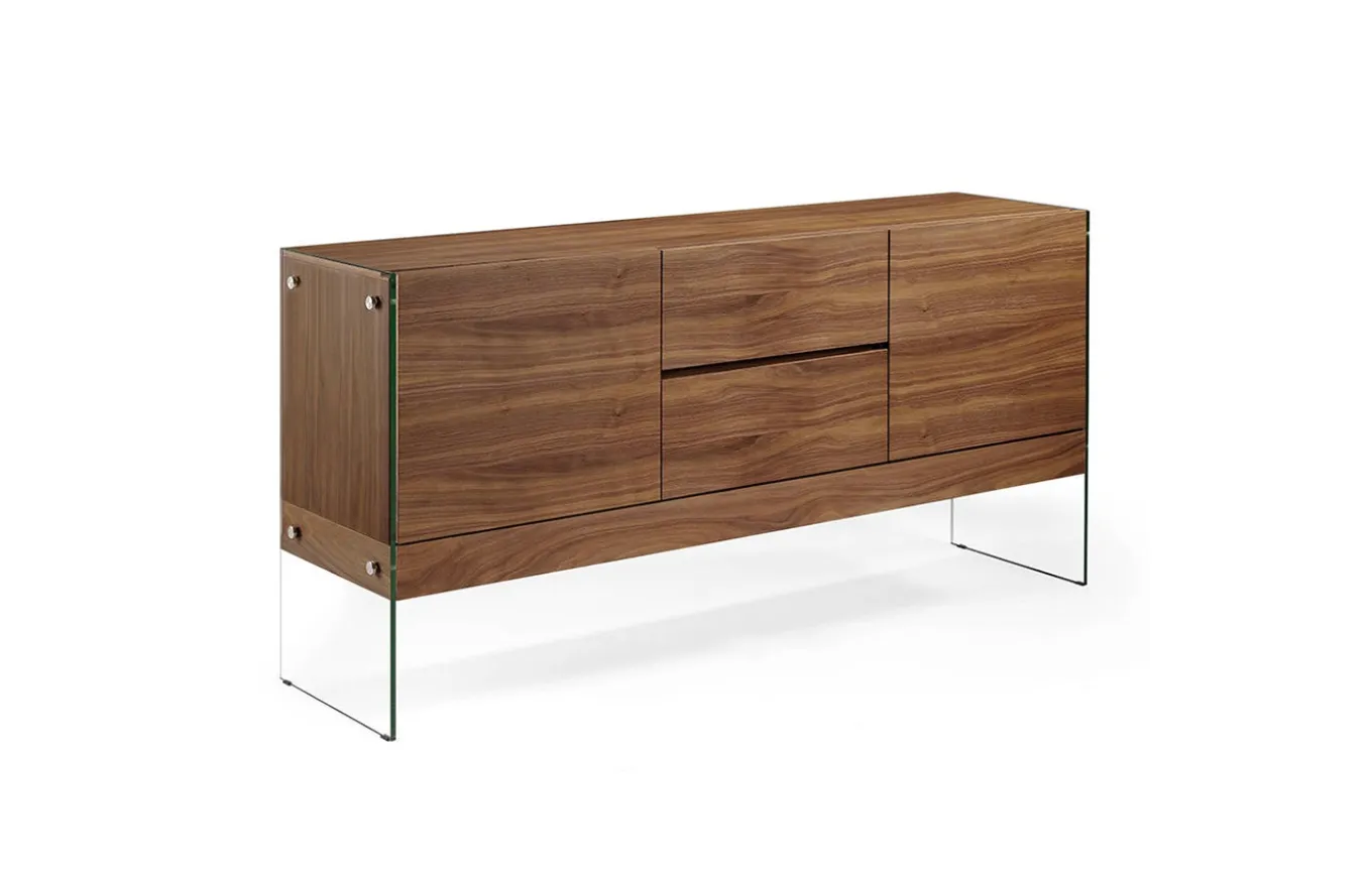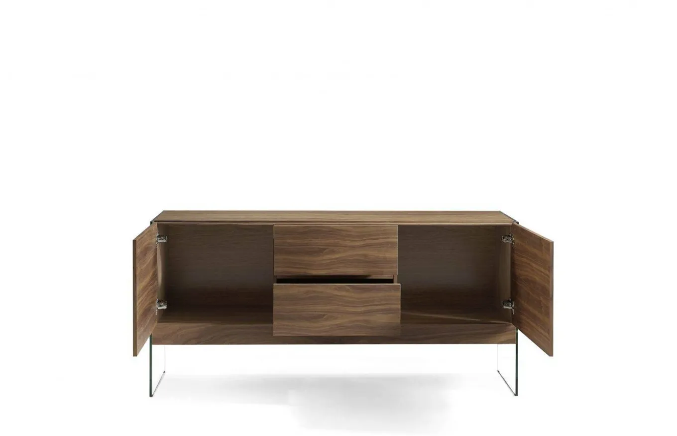 - Aparador de madera chapado en nogal con laterales de cristal templado.