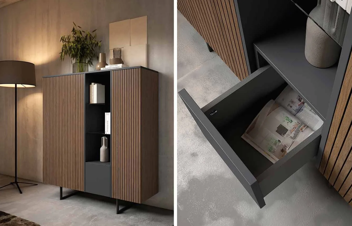 El aparador Arlo IB03 es ideal para realzar, de manera sofisticada, el salón o comedor de tu hogar. El aparador destaca por la combinación de acabados, pues la estructura en chapa de madera y los frentes en Boreal, combinan a la perfección con el lacado en color grafito.