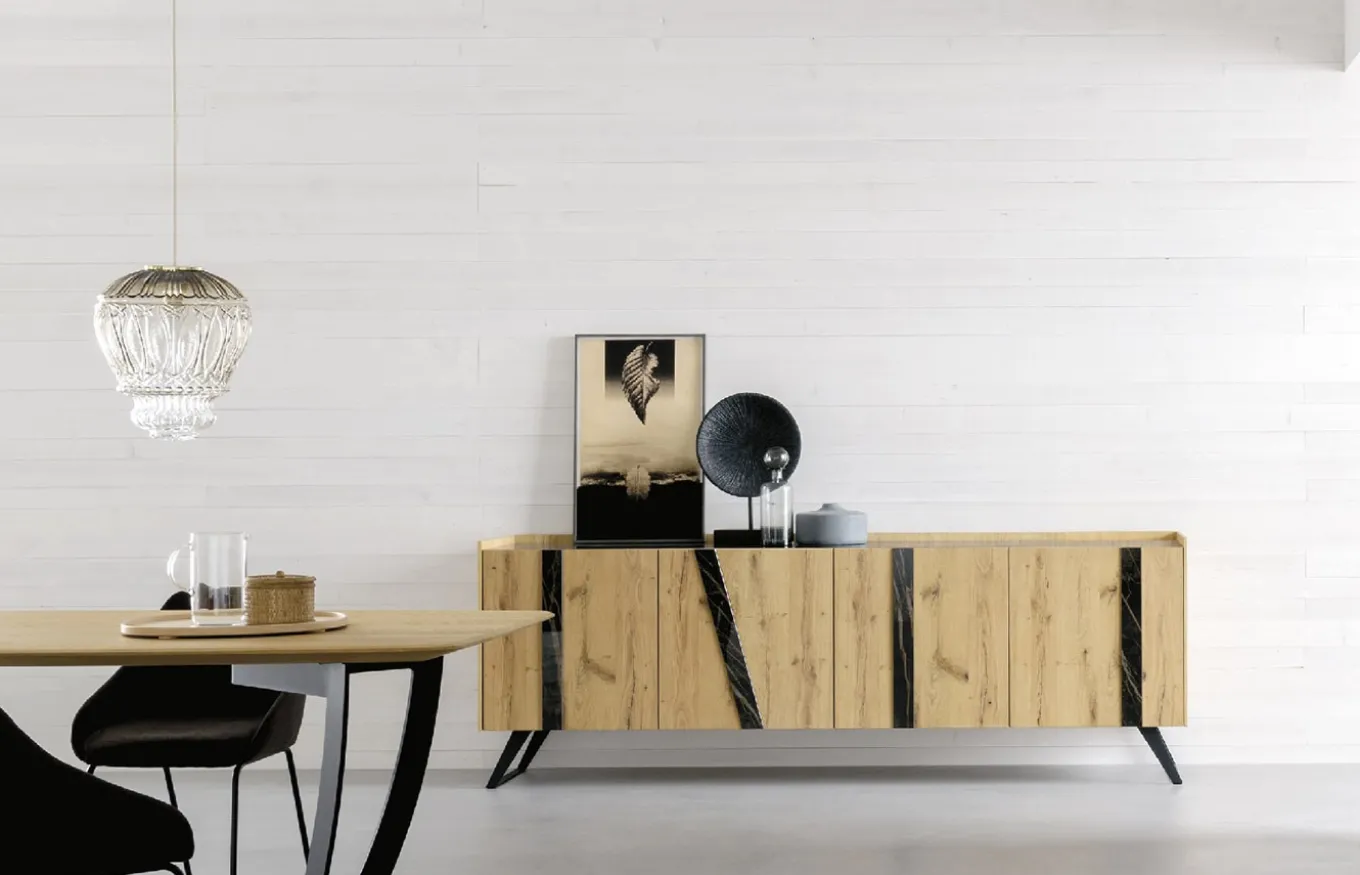 Elly es un aparador de cuatro puertas con patas metálicas negras y con inserciones y tapa laminada en Noir Desir. Esta combinación de colores enriquecen ambientes elegantes y serios. Si deseas combinar el aparador Elly en otro acabado, y te sacamos presupuesto.