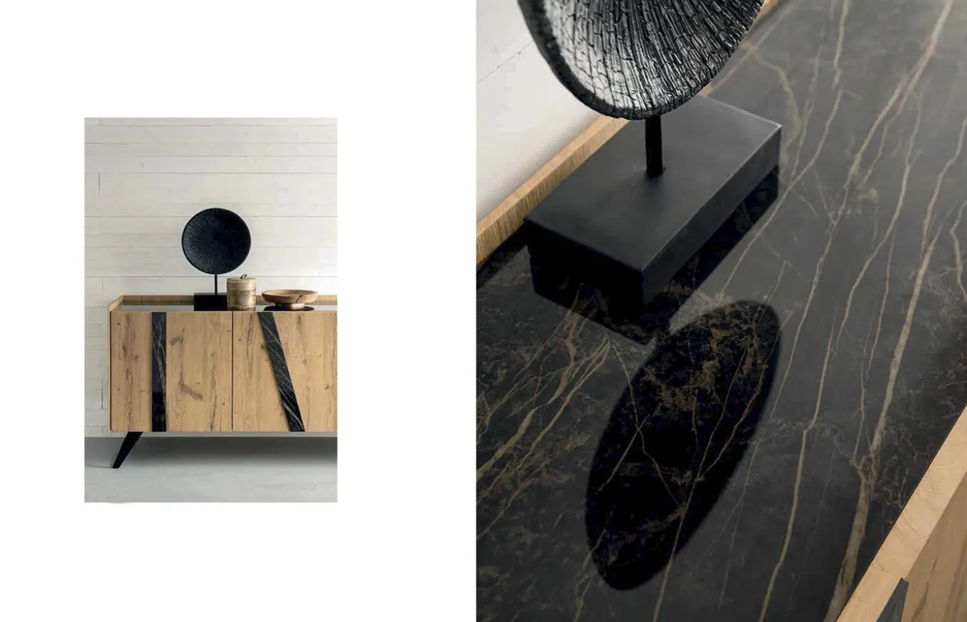 - Imagen de portada: Estructura en Roble Kuba, encimera cerámica color Noir Desir, puertas Roble Kuba con detalle en cerámica color Noir Desir y patas metálicas Nero.