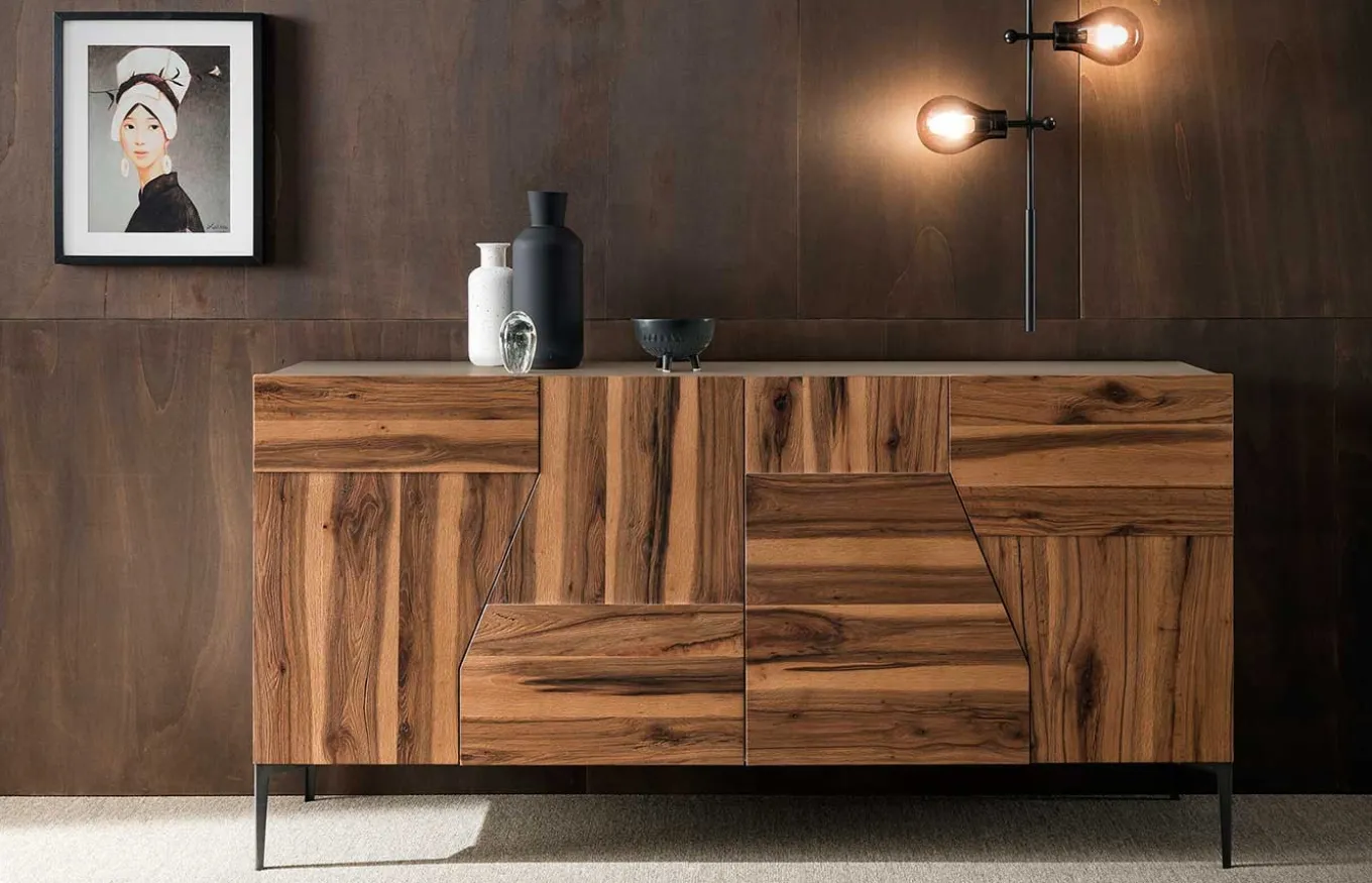 Aparador Daisy. El diseño de Rivanova es muy funcional, fácil de interpretar, pero al mismo tiempo rico en detalles dados por los materiales utilizados: madera natural, cristal y hierro. Rivanova selecciona la madera por su singularidad, realzada por imperfecciones naturales que son consideradas parte integrante del resultado final que se quiere conseguir.