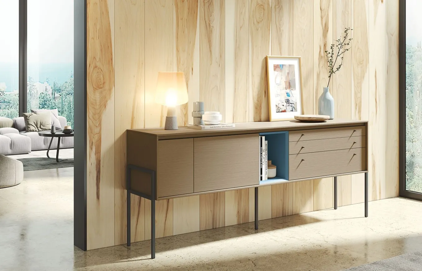 Aparador de estilo moderno. La colección Kross se desarrolla en torno a una gran variedad de módulos con distintas medidas, puertas batientes, abatibles, cajones y una multitud de opciones con diversidad de materiales y acabados. Una manera diferente de entender el mueble, pensado no solo para ordenar, sino para el placer de crear y diseñar tu propio mueble.