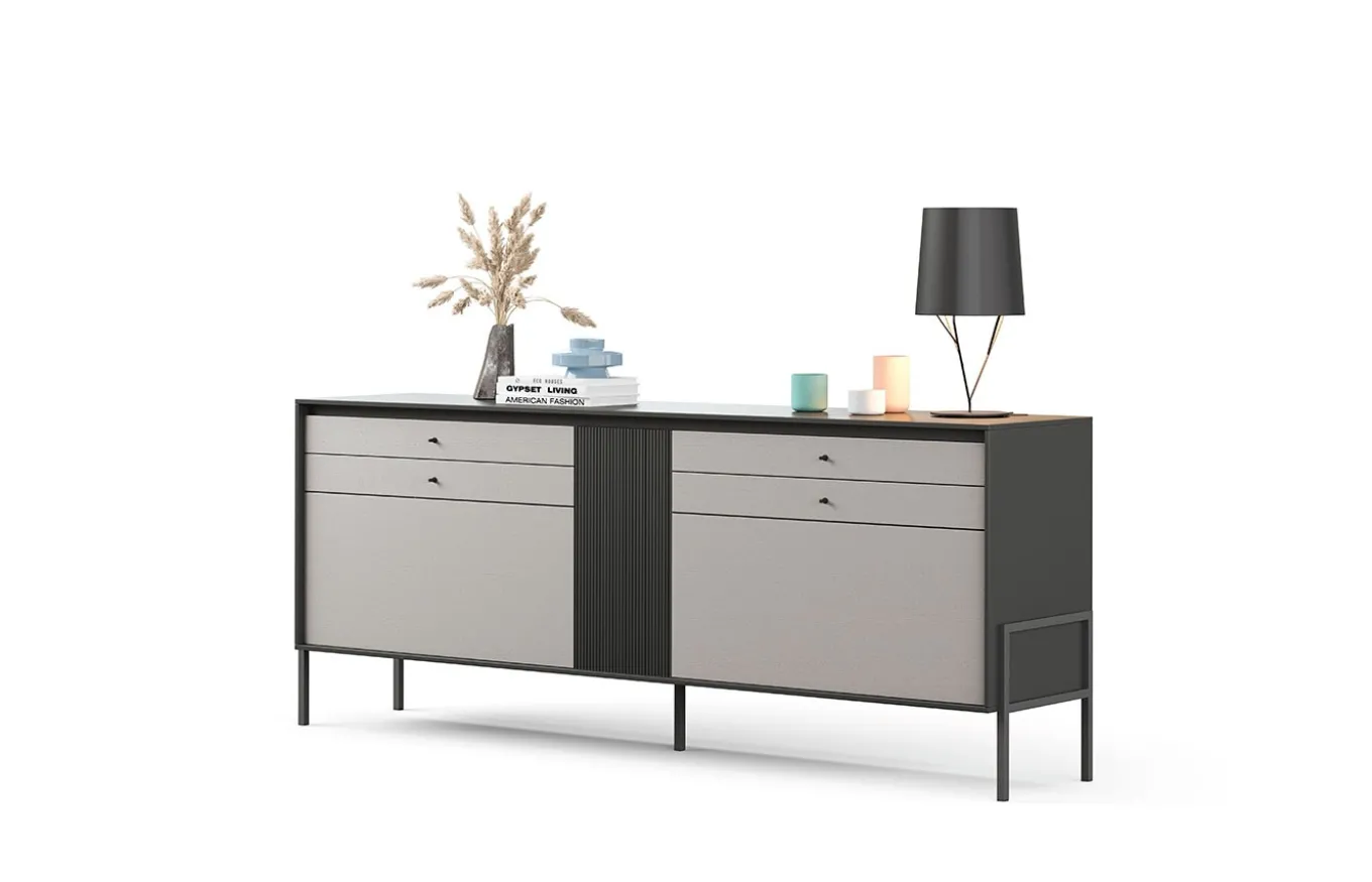 Aparador de estilo moderno. La colección Kross se desarrolla en torno a una gran variedad de módulos con distintas medidas, puertas batientes, abatibles, cajones y una multitud de opciones con diversidad de materiales y acabados. Una manera diferente de entender el mueble, pensado no solo para ordenar, sino para el placer de crear y diseñar tu propio mueble.