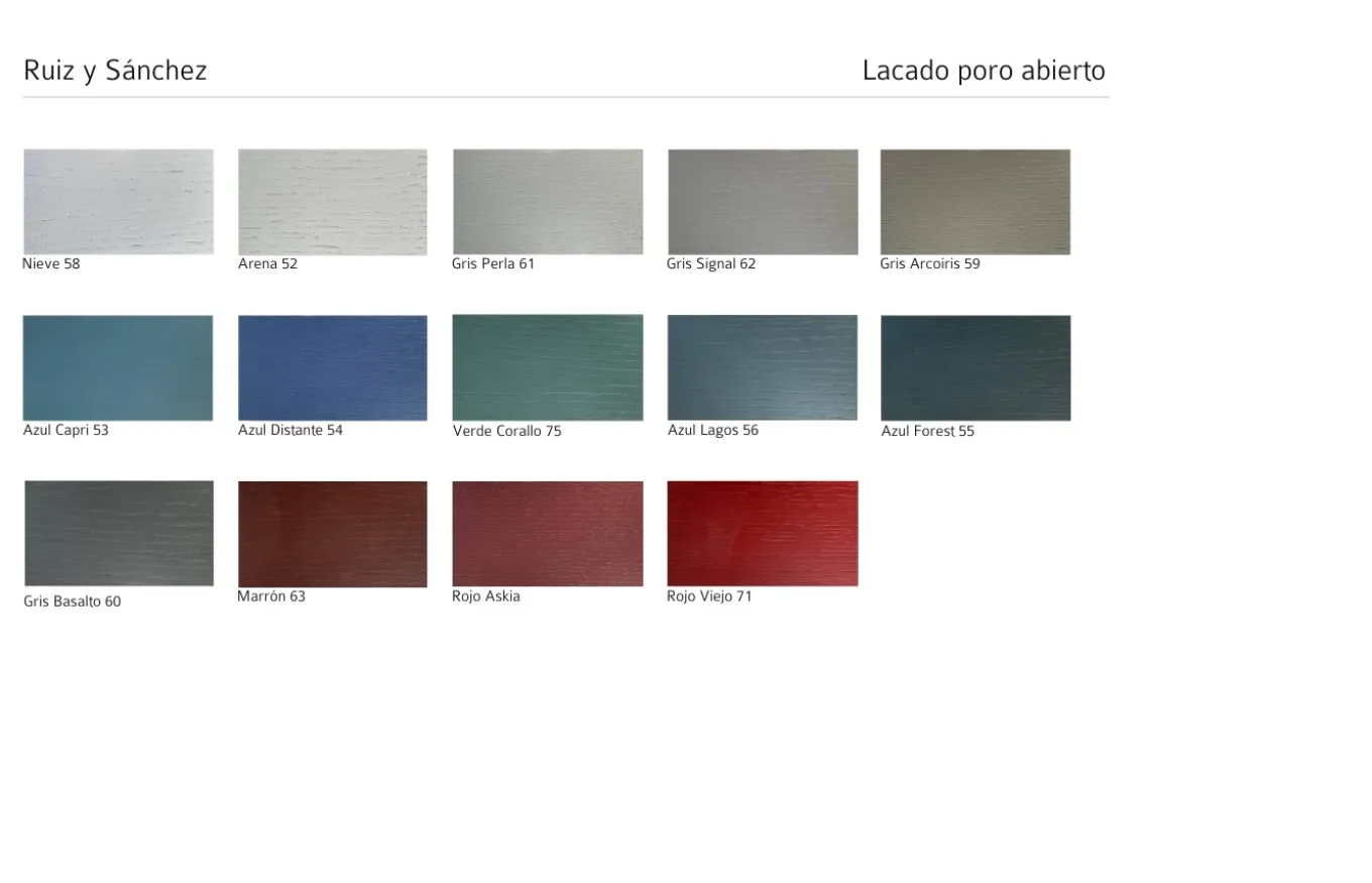 - Existen tres tipos de acabados, lacados acrílicos sobre MDF (LA), lacados acrílicos a poro abierto sobre roble (PA) y acabados naturales sobre roble.