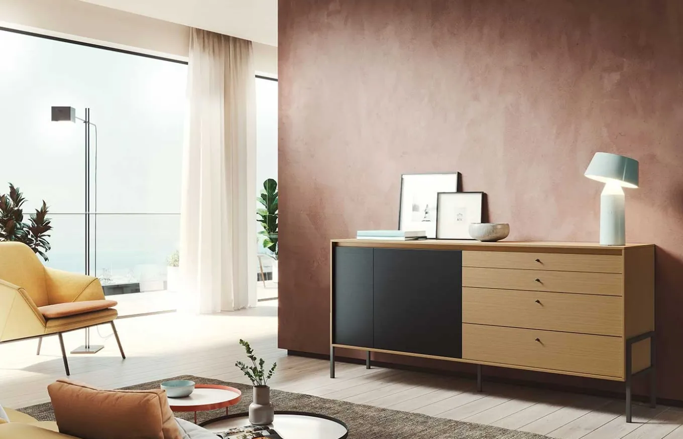 Aparador de estilo moderno. La colección Kross se desarrolla en torno a una gran variedad de módulos con distintas medidas, puertas batientes, abatibles, cajones y una multitud de opciones con diversidad de materiales y acabados. Una manera diferente de entender el mueble, pensado no solo para ordenar, sino para el placer de crear y diseñar tu propio mueble.