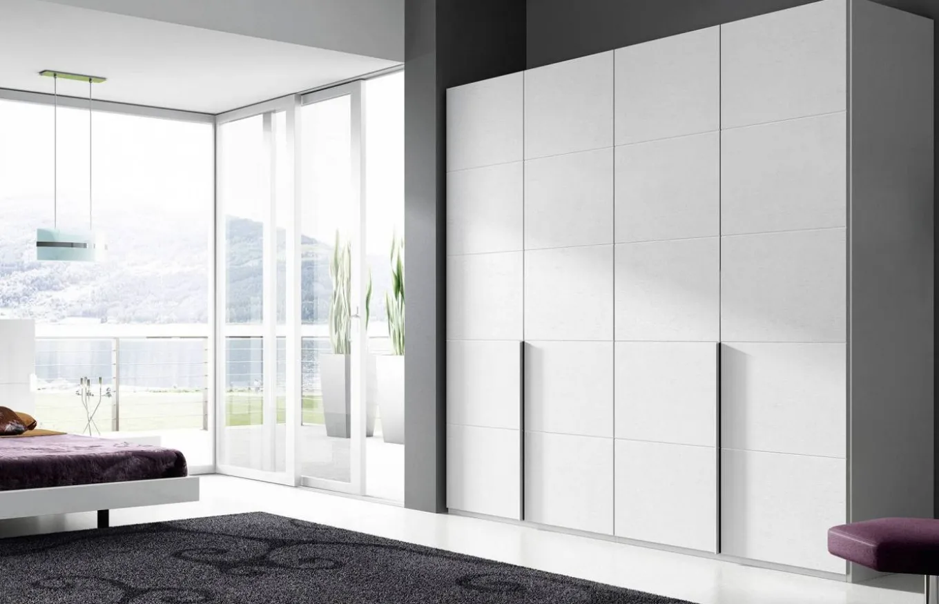 El armario de la imagen tiene cuatro puertas batientes modelo II con tiradores alternos. El acabado de la imagen es con chapa de madera natural en color F.05 Blanco.