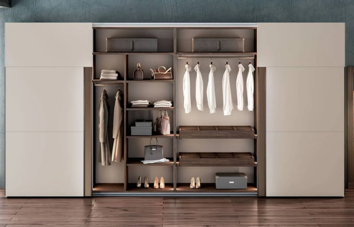 - El interior del armario es personalizable igual que las medidas, por lo que este armario viene de serie vacío y hay que pedir el interior a parte. El catálogo cuenta con gran variedad de opciones de almacenaje y complementos que puedes incluir para adaptar tu armario a tus necesidades en función de lo que quieras guardar en él, si lo compartes, etc.