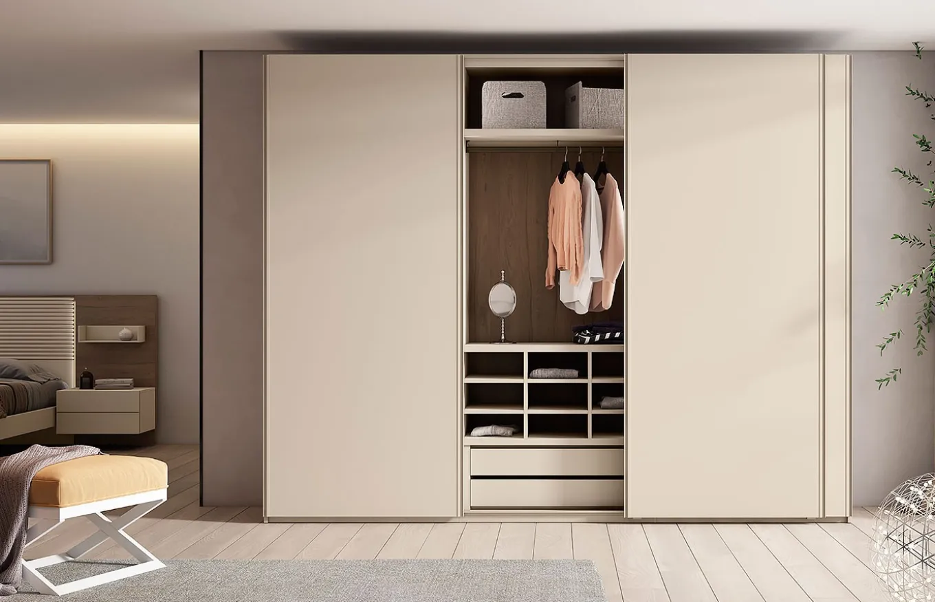 El armario liso Be es amplio y elegante. Cuenta con un gran espacio en su interior para mantener tu habitación ordenada. Los armarios de puertas correderas colgadas son una opción práctica y elegante.