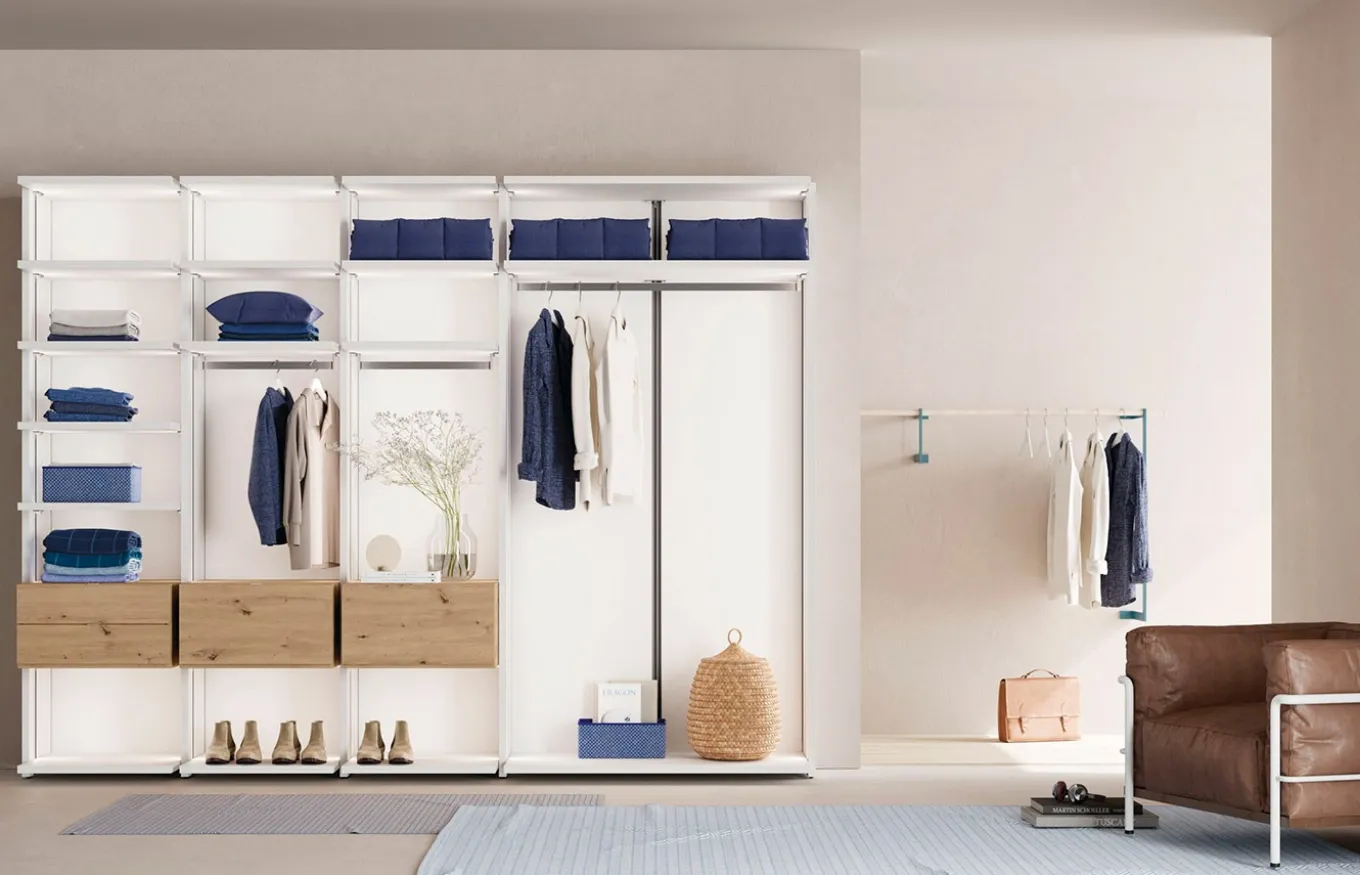 Aporta amplitud y luminosidad a tu dormitorio con el vestidor abierto de Lagrama. Su diseño diáfano y minimalista crea una sensación de espacio y orden, a la vez que aporta un toque de elegancia a tu decoración. Olvídate de los armarios cerrados y disfruta de la comodidad de tener tu ropa y accesorios a la vista. Personaliza tu vestidor eligiendo entre una amplia gama de acabados y accesorios para que combine a la perfección con tu estilo. Aprovecha al máximo la luz natural gracias a las columnas abiertas de aluminio. Opta por la iluminación LED para crear un ambiente cálido y acogedor incluso en los rincones más oscuros.