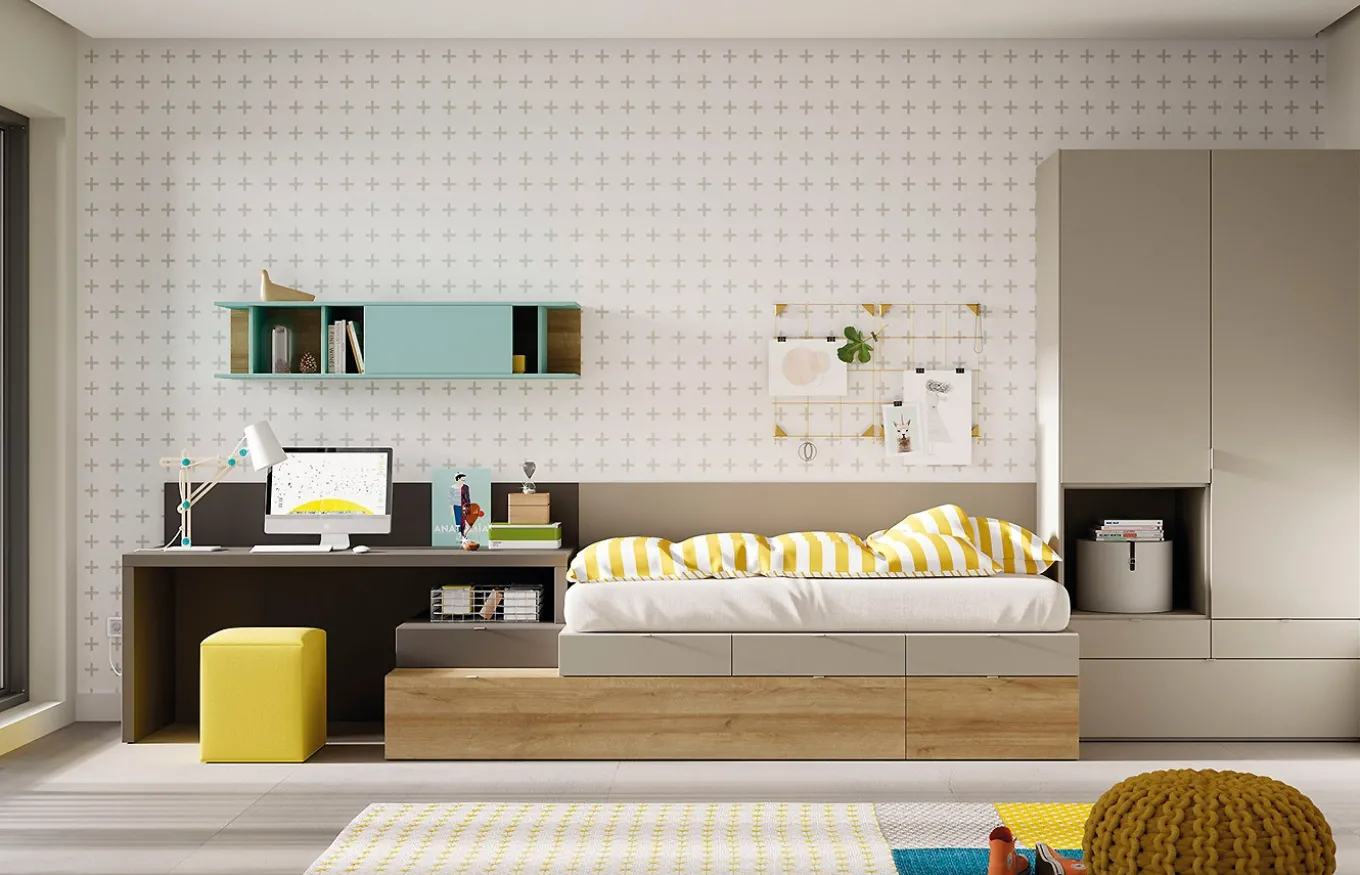 La cama juvenil Kubox con escritorio integrado tiene un estilo moderno, es práctica y funcional. El sistema Kubox permiten configurar estancias de forma libre. Puedes construir tu cama con módulos de cajones Kubox, de tal forma que puedes adaptar y diseñar tu cama según las dimensiones de la habitación y siempre disponiendo de un gran espacio de almacenaje totalmente accesible.