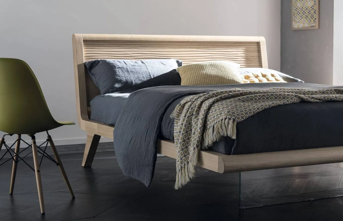 La cama Willow de AltaCorte está fabricada en madera maciza de roble europeo con un diseño de líneas rectas y sencillas. El cabecero está ligeramente inclinado y tiene un detalle de textura ranurada. La cama lleva además una pata de vidrio que le da un toque diferente. Para su elaboración se utilizan colas vinílicas con base de agua y resinas ureicas de acuerdo con la normativa europea vigente.