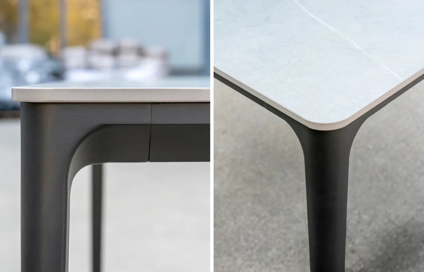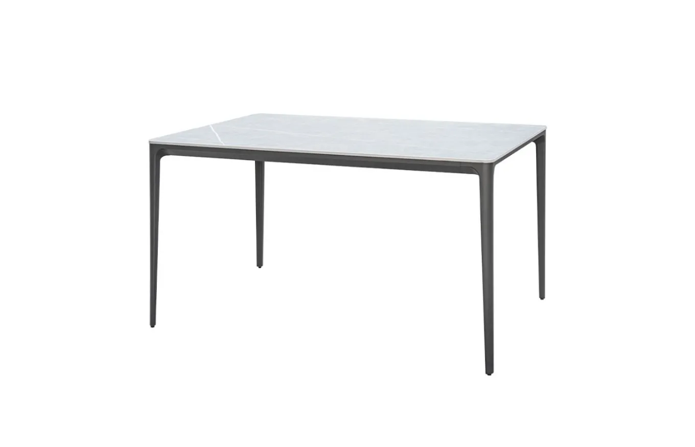 La mesa de comedor tiene una estructura de aluminio en color blanco o antracita que proporciona resistencia y durabilidad al aire libre. Sobre esta estructura se encuentra el tablero de piedra de imitación mármol que aporta un toque de elegancia y además es fácil de limpiar.