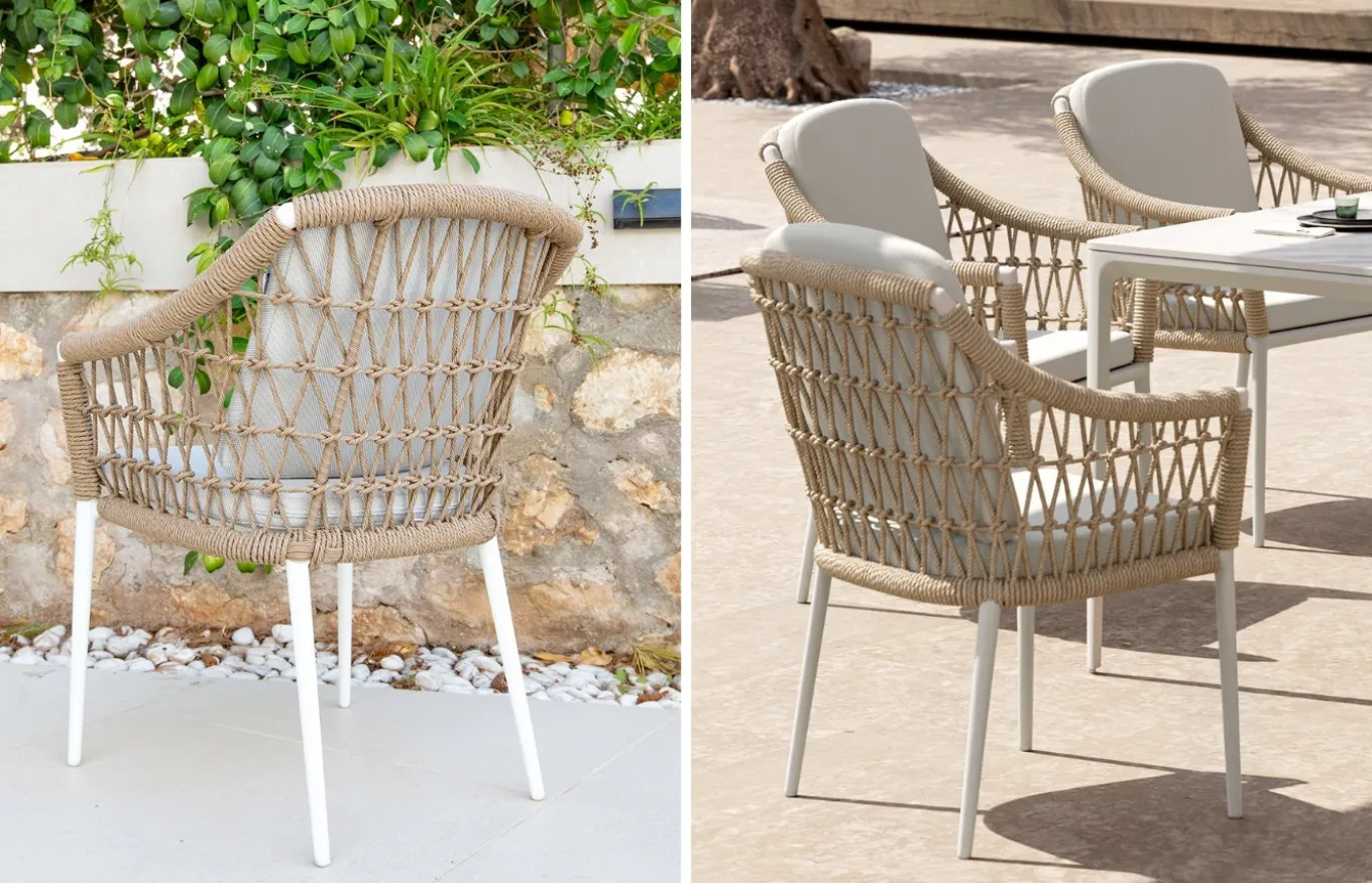 El sillón de comedor Florida tiene una estructura de aluminio en color blanco ligera y resistente, con un respaldo y laterales en cuerda trenzada a mano de color natural y unos cojines de color beige aptos para exterior, que ofrecen una experiencia de asiento cómoda.