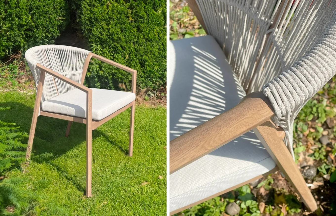Los sillones tienen una estructura de aluminio con acabado imitación madera al igual que la mesa, con un respaldo con cuerda trenzada a mano en color beige oscuro y unos cojines en color beige aptos para exterior.