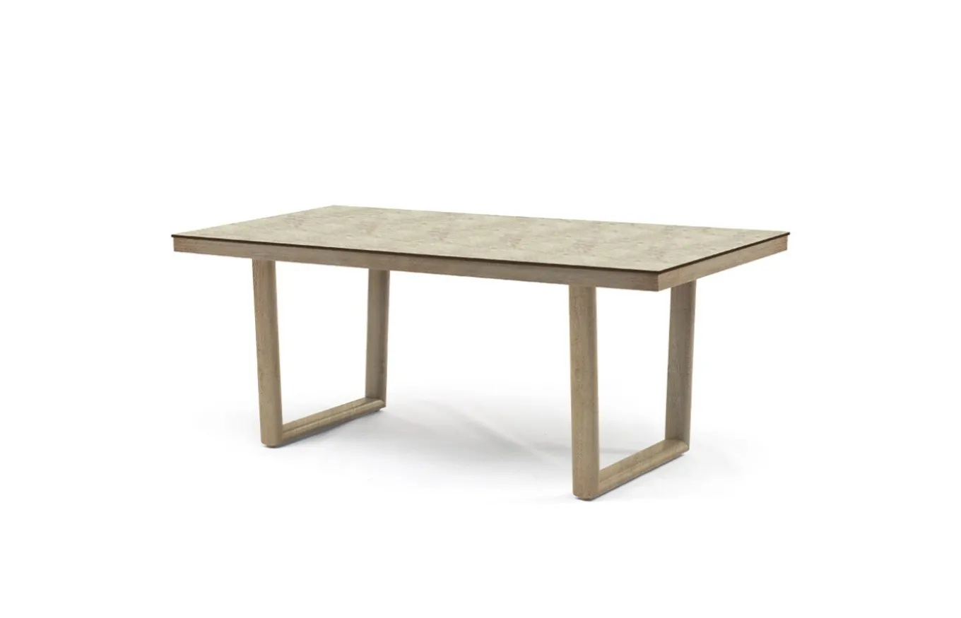 La mesa tiene una estructura de aluminio en acabado imitación madera y un tablero de HPL de 12 mm imitación madera, proporcionando resistencia y durabilidad combinado de la estética cálida de la madera natural.