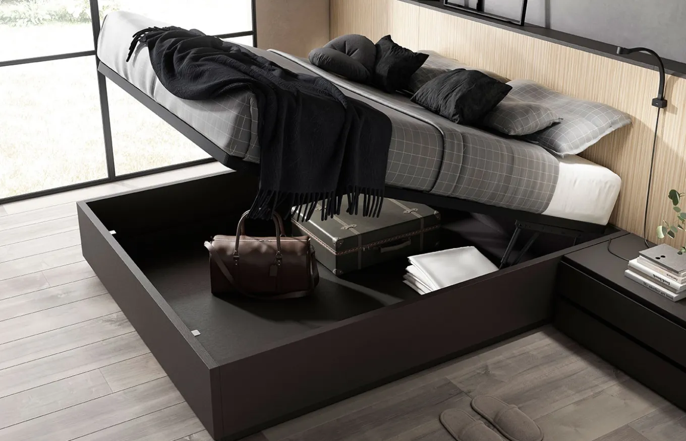 La composición de dormitorio 22 destaca por su cabecero corrido de pared a pared, además, presenta una repisa aprovechable de 14 cm ideal para decorar el dormitorio con marcos de fotos, cuadros, libros…