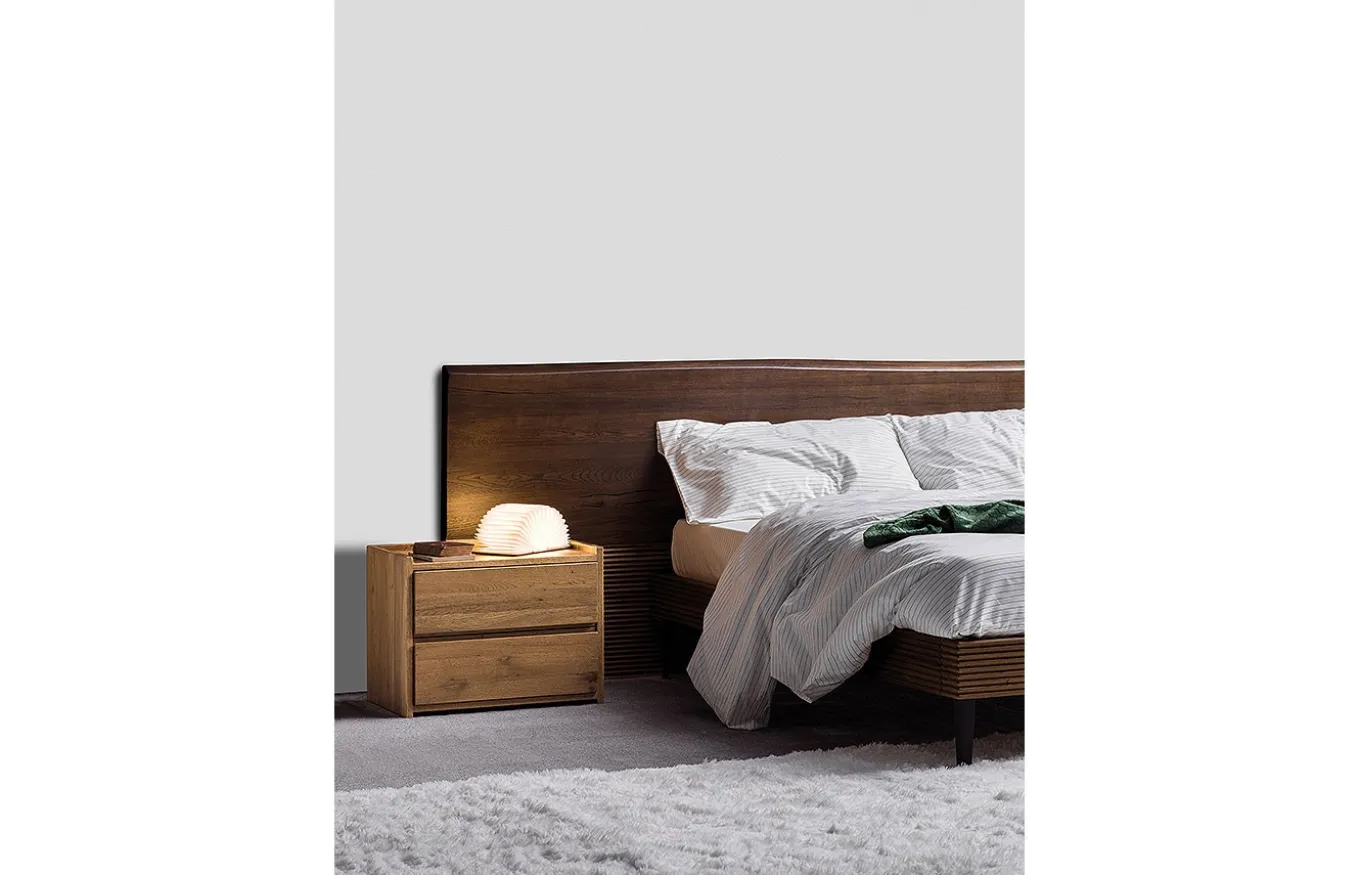 *El acabado de la imagen es cama en Dark Brown, mesilla en Holand Naturale, mesilla redonda en lacado poro abierto Giada.