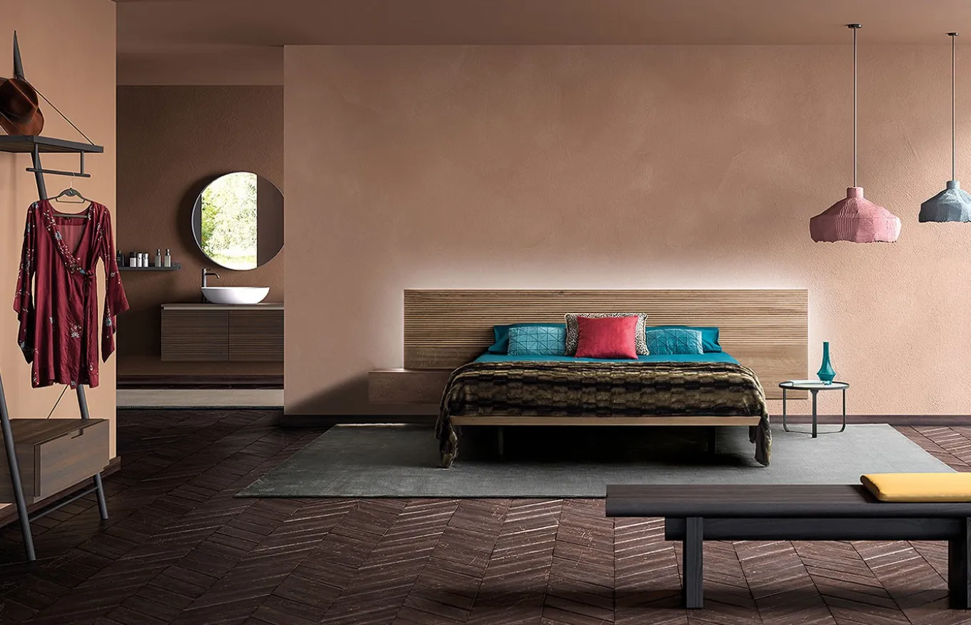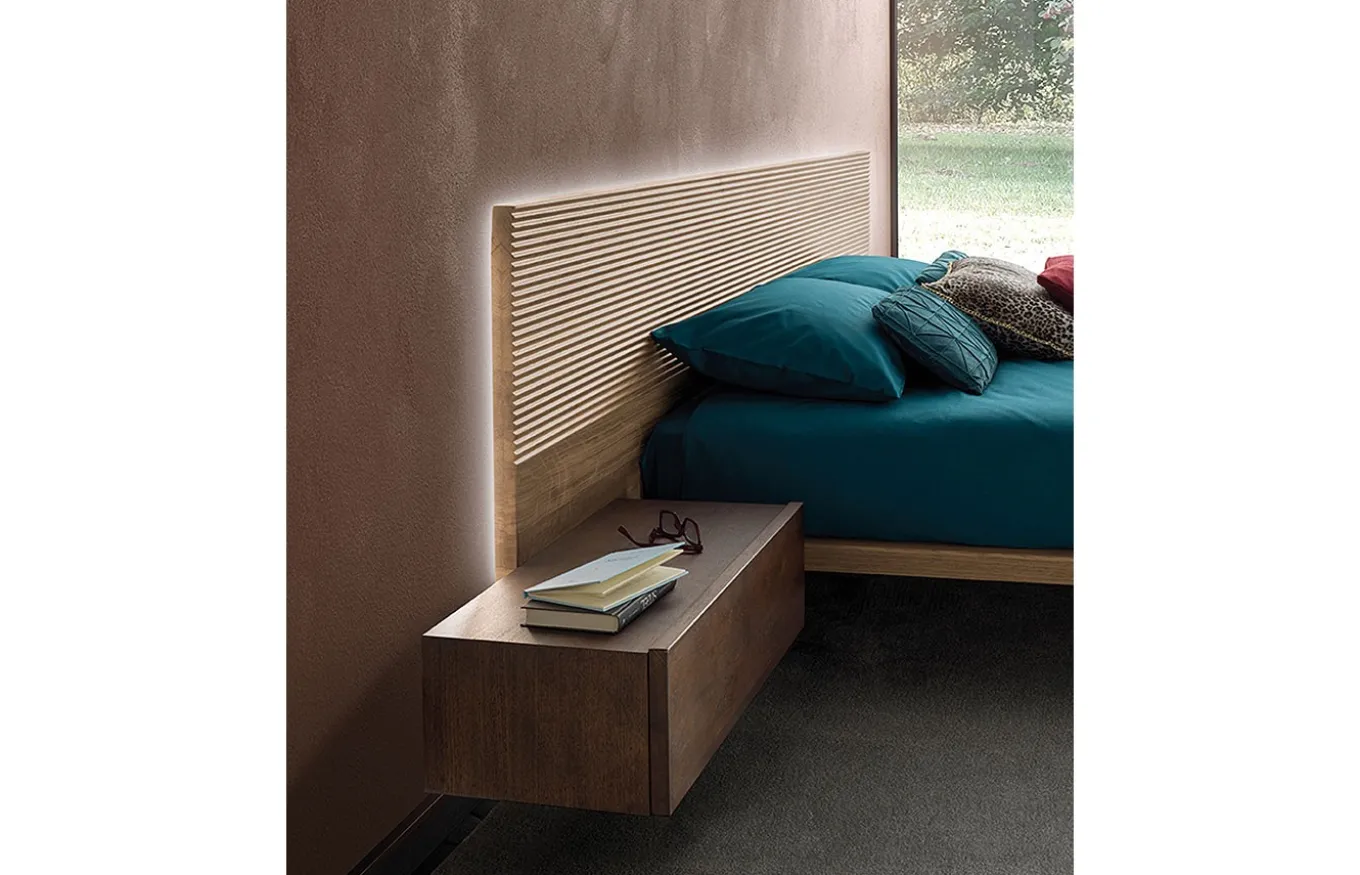 Composición de dormitorio con cabecero Zen suspendido perteneciente a la colección Free Beds de , una marca de diseño y fabricación italiana.