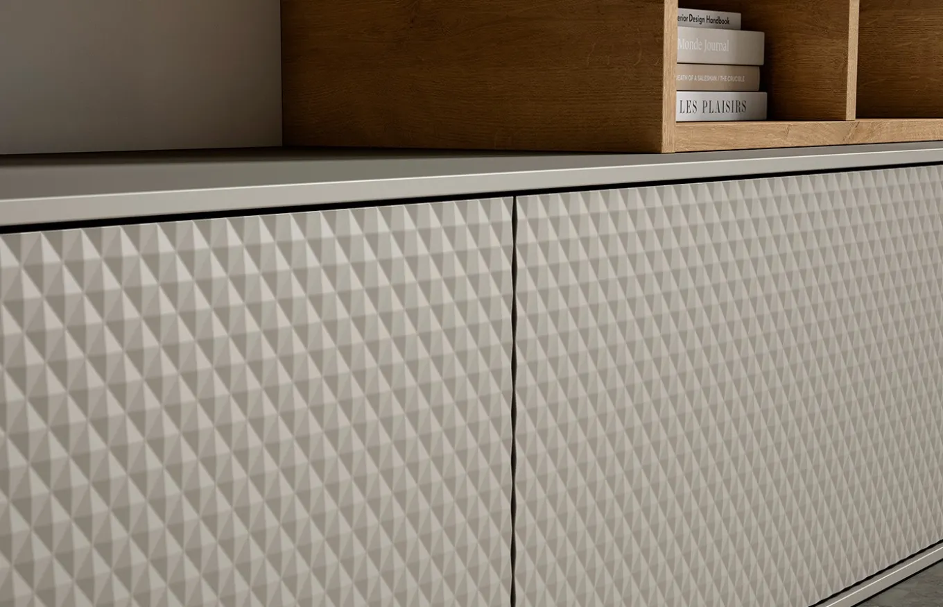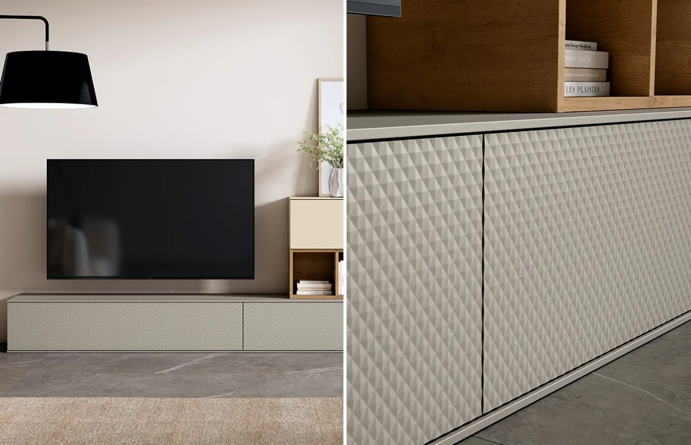 La composición de salón Individual 03 de Lan Mobel se distingue por incorporar el exclusivo frente QBIC, un diseño sofisticado y geométrico que se ofrece siempre en acabado lacado para resaltar su relieve. Esta composición cuenta con dos módulos bajos con puertas abatibles y frentes QBIC, revestidos por una fina tapa de 1 cm de grosor que aporta ligereza visual. A la derecha, se integra un módulo vertical con puerta abatible que oculta en su interior estantes funcionales, ideales para almacenamiento.