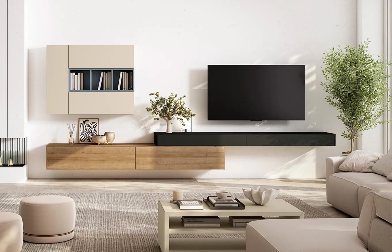 La composición de salón Individual 08 de Lan Mobel es un elegante mueble TV colgado que combina dos módulos de 242 cm superpuestos: uno con puertas abatibles y otro con cajones, ambos revestidos en el exclusivo LOOK TOTAL THIN, un revestimiento de 1 cm que aporta ligereza visual y un diseño moderno. Completando el conjunto, incluye una estantería colgada con tres puertas y huecos abiertos ideales para decoración.