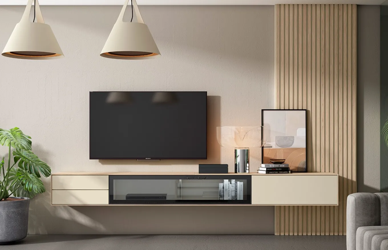 Esta composición de salón de la colección Individual de Lan Mobel apuesta por un diseño moderno y sofisticado, cuenta por un mueble TV colgado que combina funcionalidad y estilo. Incorpora una puerta abatible, una vitrina con cristal, y dos cajones, ofreciendo un almacenamiento versátil y ordenado.