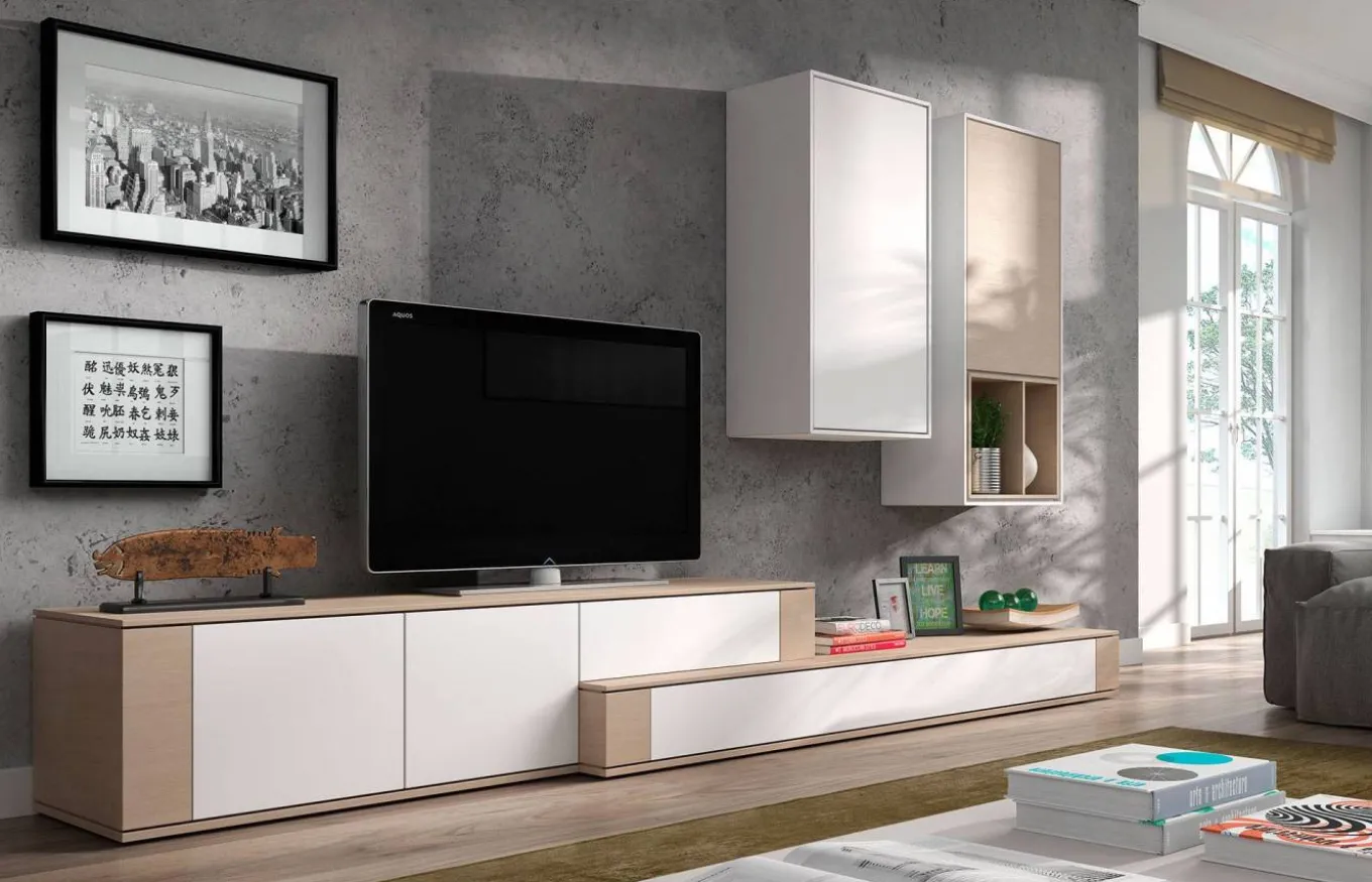 El mueble para televisón destaca por el juego de profundidades de las dos piezas que lo forman creando una combinación única. El complemento perfecto a esta combinación es un par de módulos verticales de colgar con espacio de almacenaje extra.