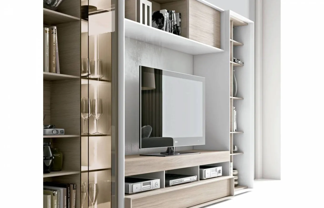 Es una composición actual y moderna con una distribución muy completa que incluye mueble para televisión, vitrina, librería, etc. Cantidad de espacio de almacenaje en diferentes formatos que hace de ella una composición de lo más polivalente.