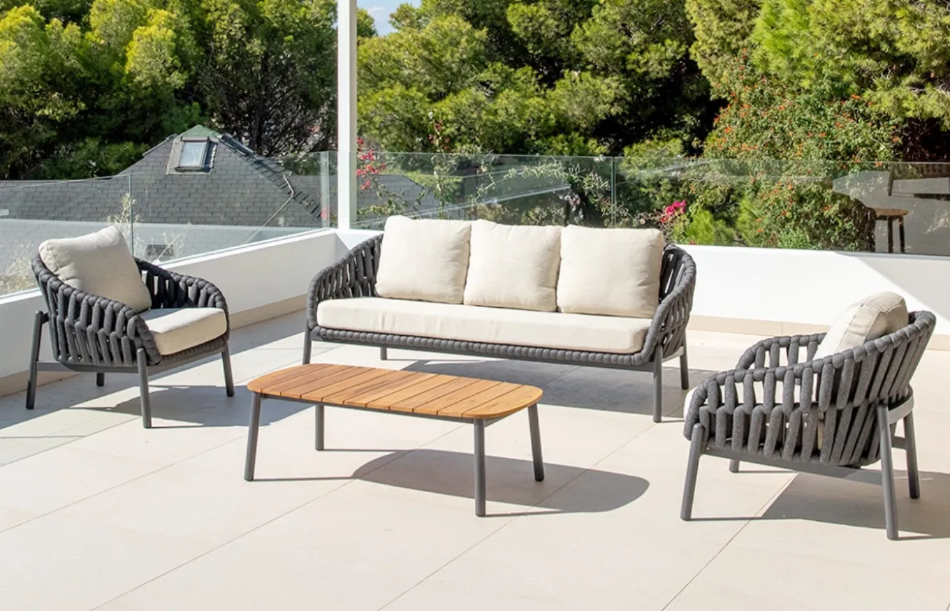 El conjunto de exterior Cairo de Majestic Garden está formado por un sofá de 3 plazas, dos sillones y una mesa de centro. Tiene una estructura fabricada de aluminio, disponible en color topo o antracita, que garantiza resistencia y durabilidad al aire libre. El respaldo y los laterales están trenzados con cuerda de poliéster 100% apta para exteriores, aportando un toque artesanal al diseño. Tanto el sofá como el sillón Cairo ofrecen una comodidad superior gracias a los cojines acolchados tapizados en color beige que ofrecen una gran resistencia a la intemperie. Por último, la mesa de centro Cairo tiene una estructura de aluminio y un tablero de madera de teca que añade un acabado cálido y natural al conjunto.