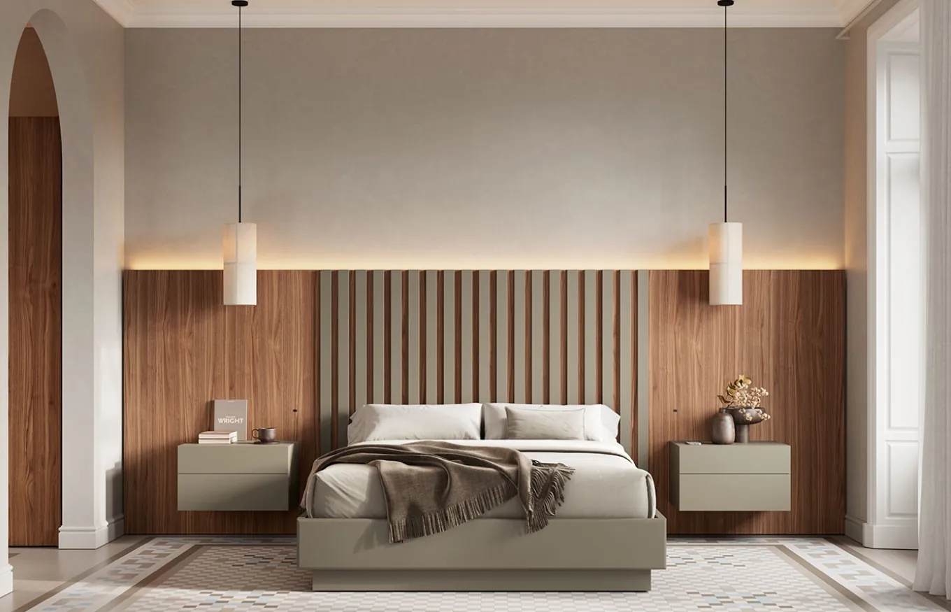 El dormitorio de Vive destaca por su diseño contemporáneo y elegante, con dos mesitas colgadas de dos cajones que aportan ligereza visual y modernidad, y un cabezal corrido que unifica el conjunto creando una sensación envolvente; los paneles laterales lisos equilibran la composición mientras que el panel central alistonado añade textura y protagonismo en la zona de la cama, todo ello acompañado por un canapé en color lacado que no solo realza la estética con un acabado sofisticado, sino que también ofrece una solución práctica de almacenamiento.