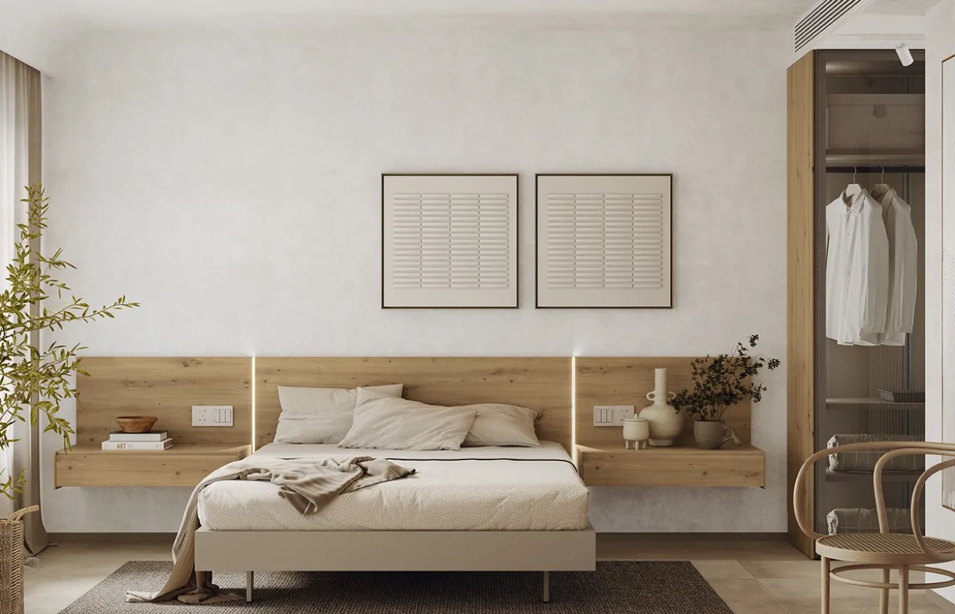 Las mesitas de noche Addliving de Lagrama completan el conjunto a la perfección. Su diseño minimalista y funcional se integra a la perfección con el cabecero Groove, creando un espacio armonioso y equilibrado.