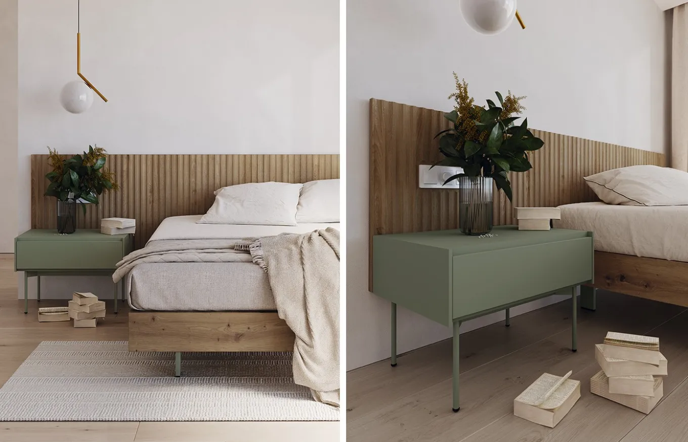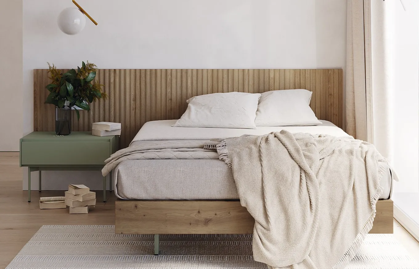 Crea un refugio de serenidad y estilo en tu dormitorio con la combinación perfecta del cabezal de madera Ona de Lagrama y la mesita de noche Addliving.