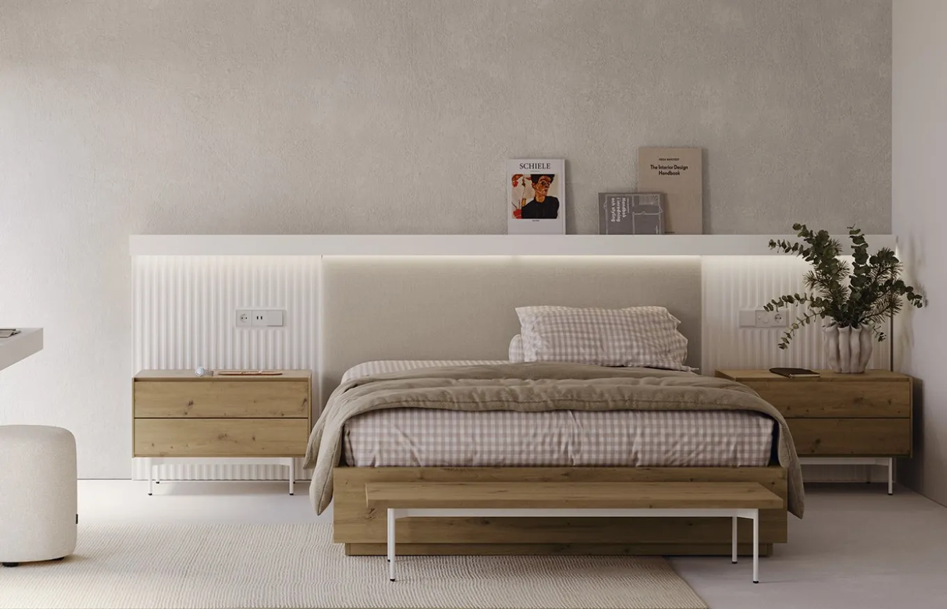 Sumérgete en un oasis de descanso y sofisticación con el cabecero ondulado Ona combinado con el cabecero tapizado de Lagrama, la pieza clave para convertir tu dormitorio en un refugio de ensueño. Su diseño atemporal y elegante, junto a la suavidad de su tapizado, te brindarán una experiencia sensorial inigualable.