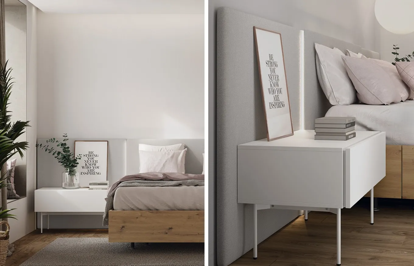 *El acabado de la imagen adjunta presenta el cabezal tapizado en color Libra 07; cama en acabado laminado color Roble; mesita de noche en acabado lacado color Blanco Disset y Cendra.
