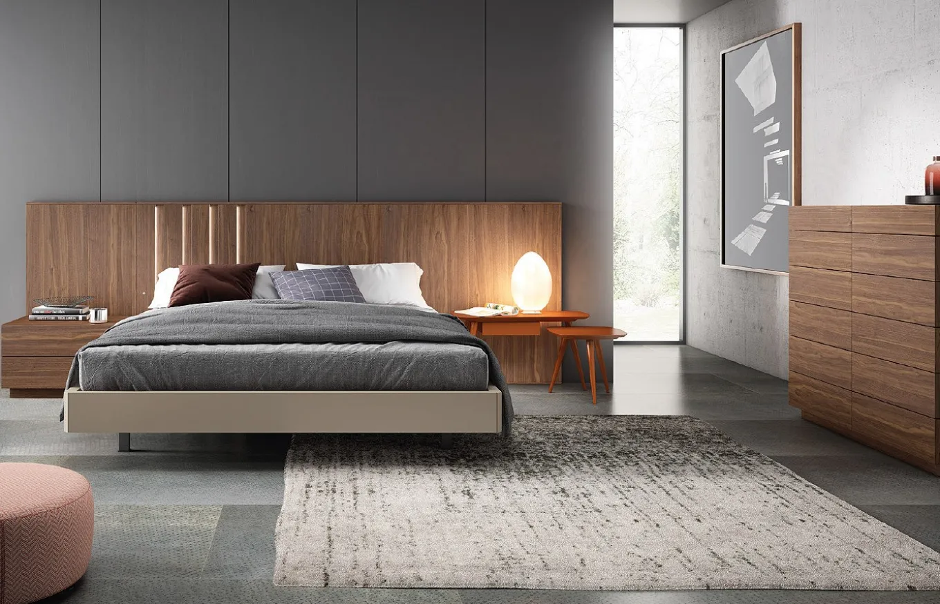 *El acabado de la imagen adjunta tiene el cabecero y la mesilla del lado izquierdo en madera de color F06, la base para la cama en lacado mate M37 y mesitas del lado derecho en lacado mate M108.