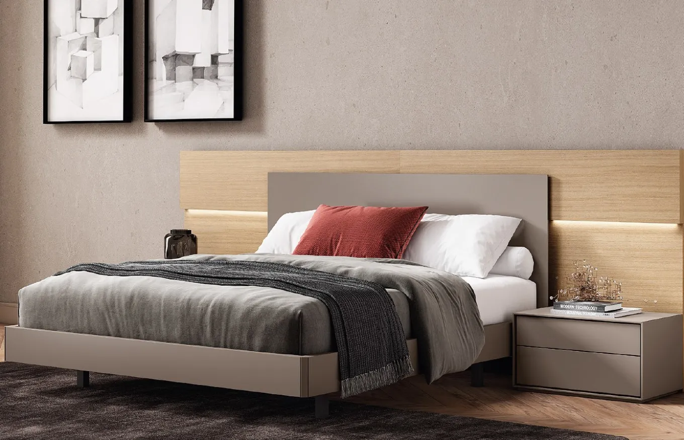 *El acabado de la imagen adjunta tiene el cabecero en lacado mate color M16 y en madera color F02, las mesillas y la base para la cama tienen un acabado en lacado mate color M16.