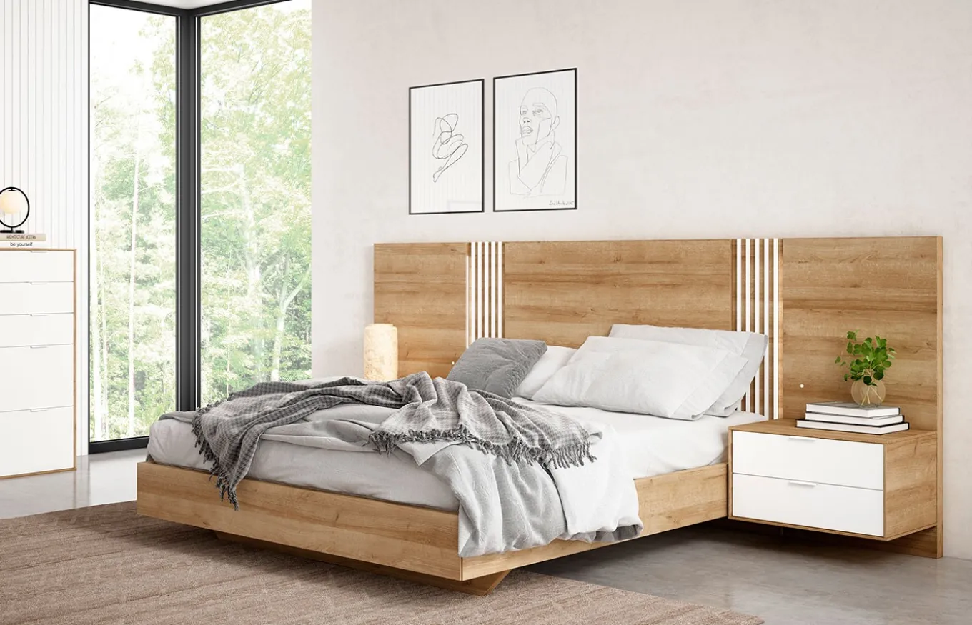 El dormitorio Lenon destaca por su apariencia cálida y acogedora. Materiales como la madera ejercen el poder de crear una sensación de bienestar y calidez. Uno de los puntos fuertes de este dormitorio son sus dos mesillas colgadas unidas al cabecero, como si de una pieza se tratara. El dormitorio Lenon se compone de un cabecero de 281.4 cm, dos mesillas de noche y una bancada para cama de 190 x 150 cm.