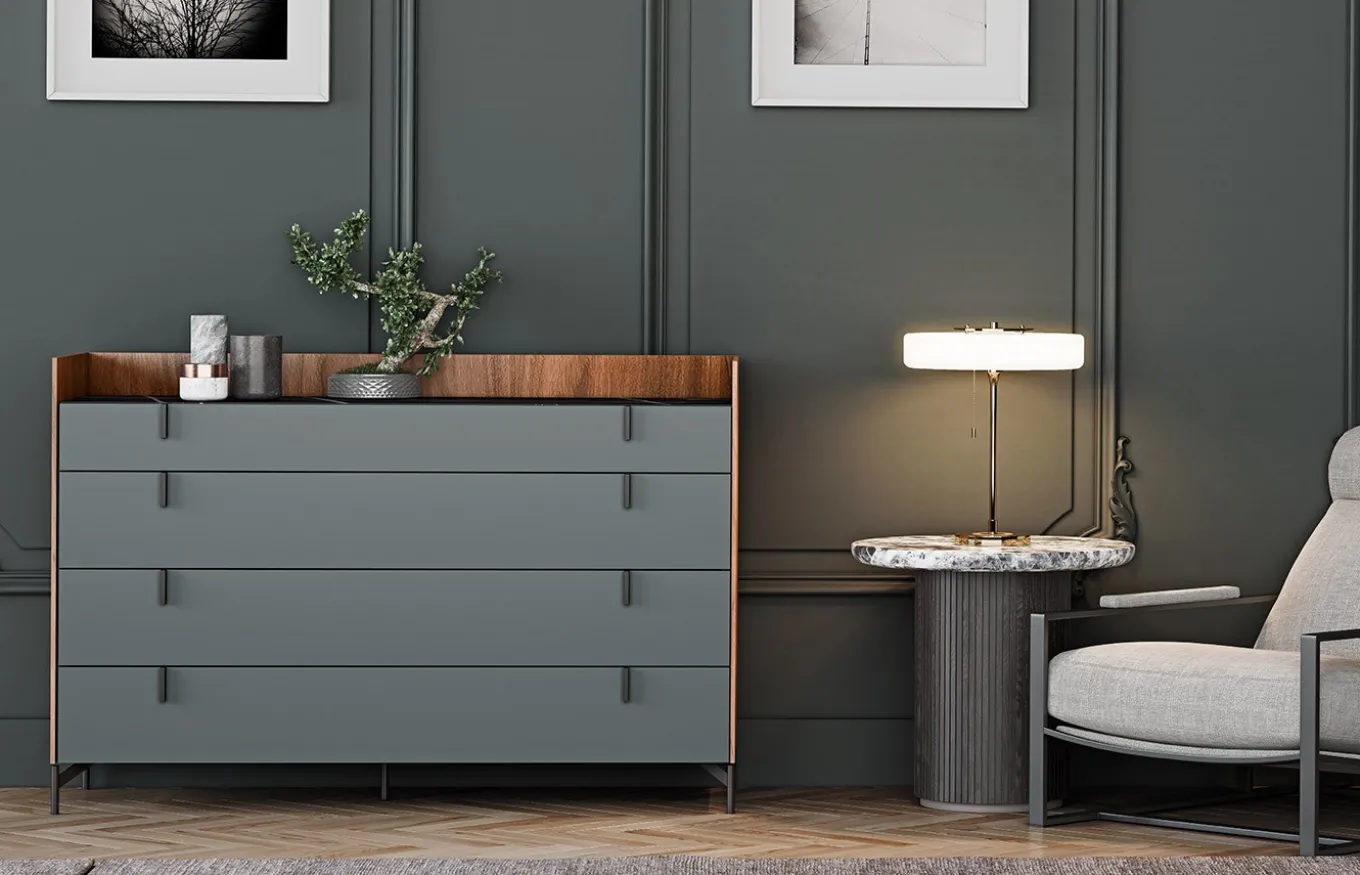 - Mesita de 2 cajones extraíbles en acabado Egeo con tirador y patas en Oro. Su tapa tiene un acabado porcelánico Stone Gris.