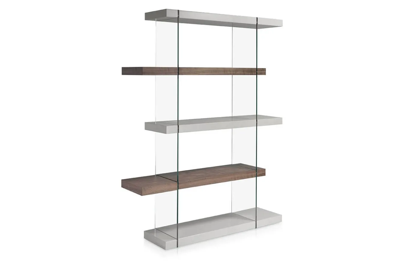 Diseño de líneas rectas, juega con la combinación de estantes de distinto acabado, y se arma en una estructura de cristal. Cada estante mide 140 cm de ancho con 6 cm de grosor y la distancia entre cada estante es de 36 cm. Su peso es de 80 kg.