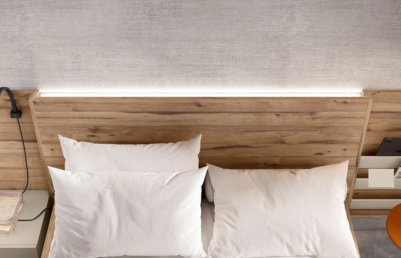 La habitación juvenil 20 llama la atención por el acabado completo en el mismo tono de la madera. Le acompañan dos mesitas de noche lacadas en colores neutros. Sin duda, esta habitación no pasa desapercibida.