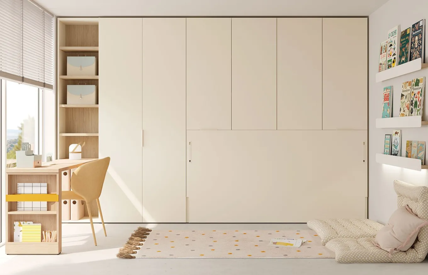 Transforma tu habitación juvenil en un espacio dinámico y funcional con la versatilidad de Jotajotape. Imagina un armario integrado con una cama plegable que se oculta a la vista, liberando espacio durante el día para estudiar, jugar o relajarte. Las soluciones de Jotajotape te permiten optimizar cada centímetro, creando un ambiente personalizado y ordenado. Con una amplia variedad de diseños y acabados, podrás adaptar tu habitación a tu estilo único, combinando funcionalidad y estética en perfecta armonía.
