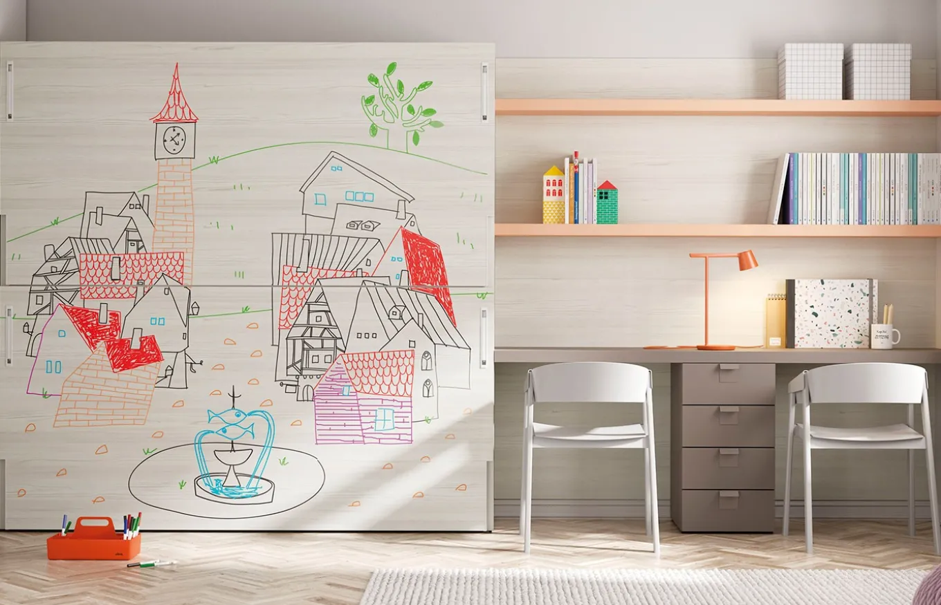 Puedes elegir varias combinaciones de mesas, para que se adapten a tus necesidades. Un acabado opcional convierte la superficie de los plafones en una pizarra tipo vileda. Las camas ofrecen una espacio para que los pequeños expresen su creatividad.