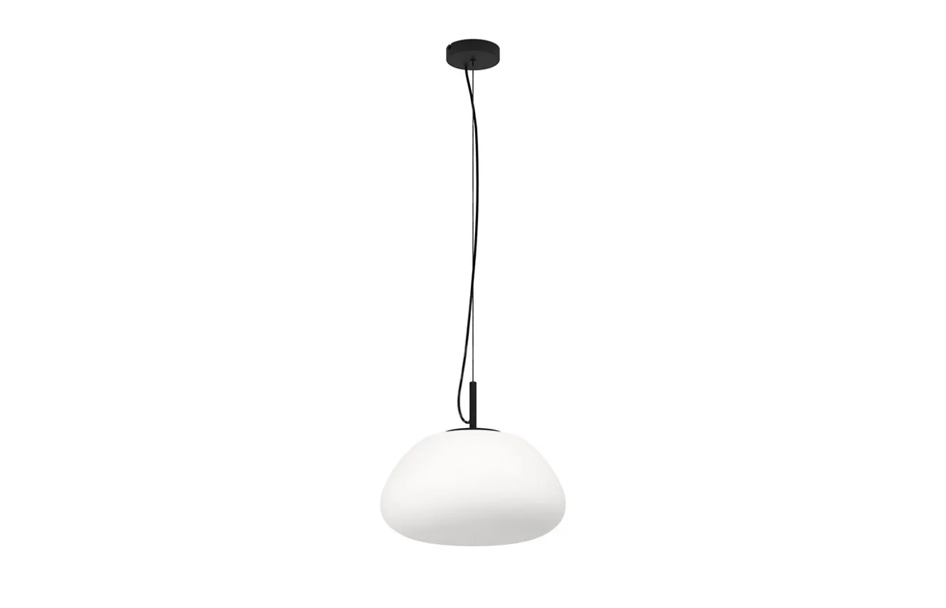 La lámpara colgante Balmes está fabricada con una pantalla de formas orgánicas de cristal mate en color blanco, está suspendida de un dosel metálico del mismo color con un cable textil en color negro y tres cuerdas metálicas. La luminaria colgante encaja perfectamente en los estilos de decoración modernos y ofrece una iluminación elegante.