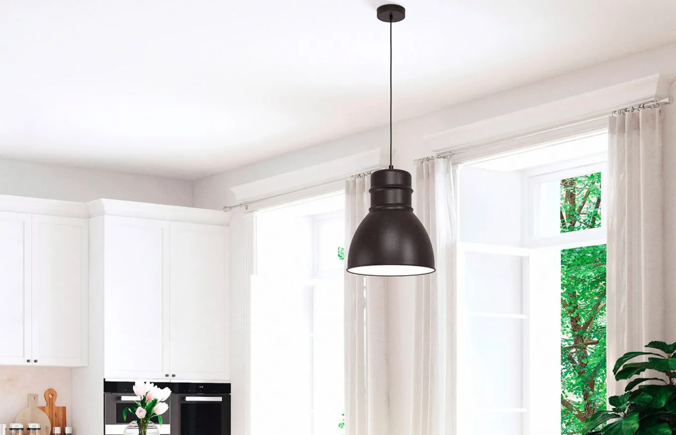 La lámpara colgante Ebury está fabricada con una pantalla suspendida de metal en color negro y un interior en color blanco. Tiene un estilo nórdico que se integra perfectamente en muchos estilos de decoración. Con su encanto industrial, la lámpara ofrece una iluminación moderna en el salón o en el comedor.