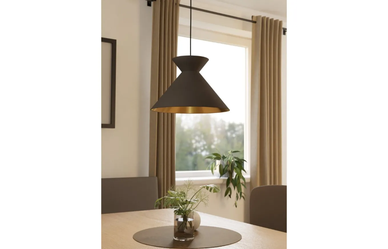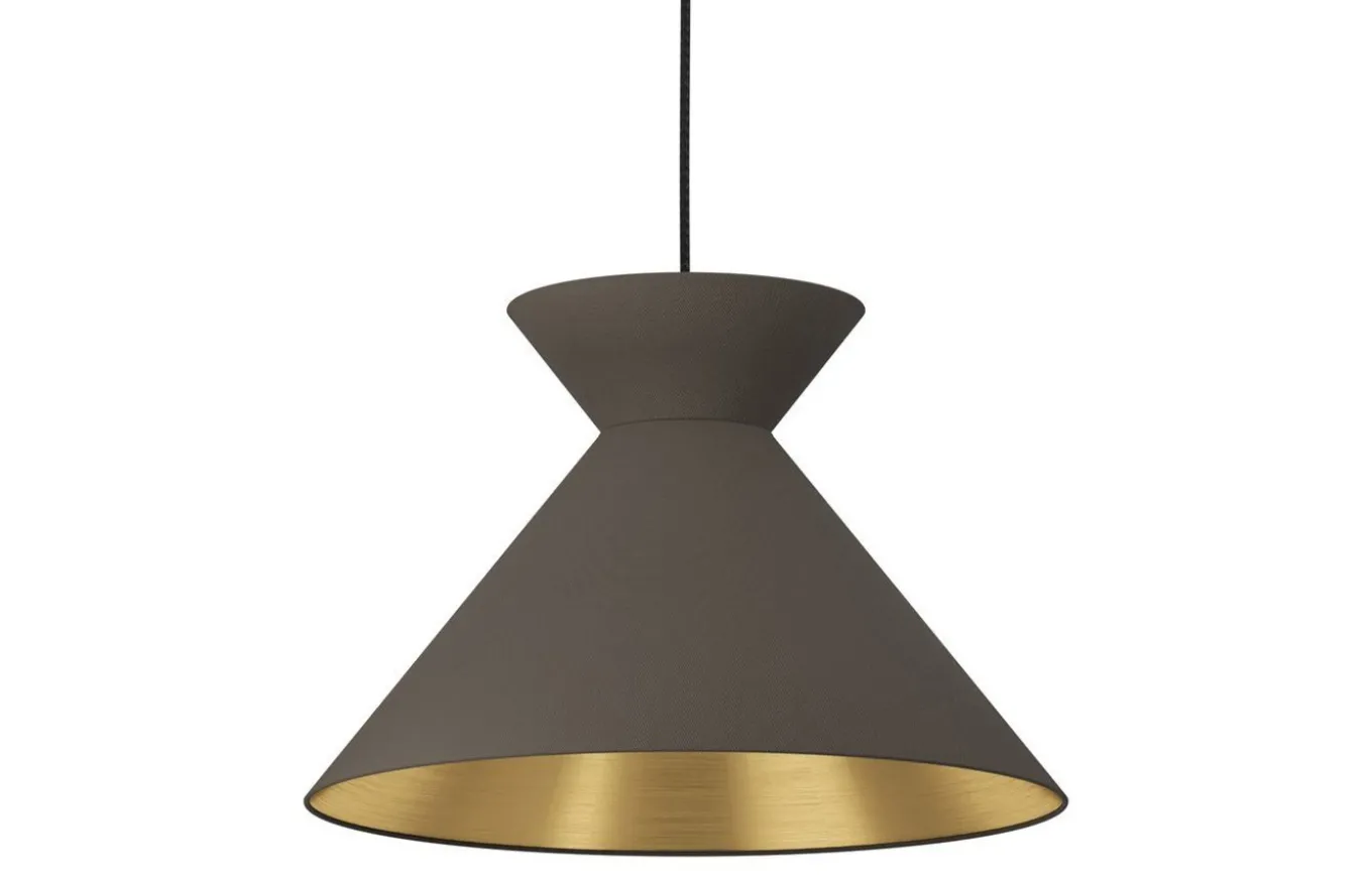 La lámpara colgante Nastasia está formada por una pantalla de metal en forma de reloj de arena en color capuchino y con interior dorado. La lámpara se combina con una suspensión de metal cepillado latón y un cable textil negro. Esta lámpara encaja bien en el salón o sobre la mesa del comedor.