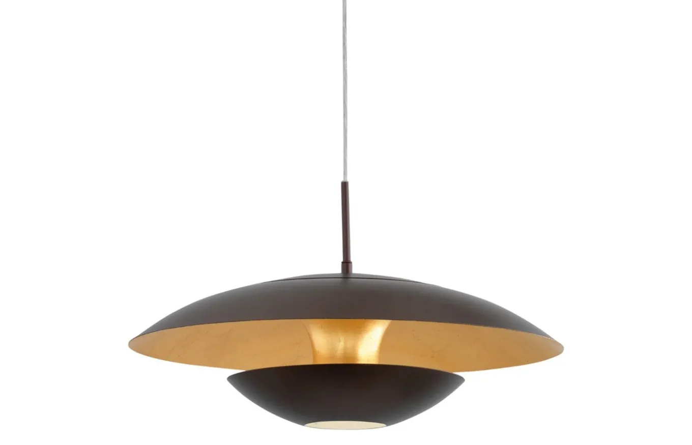La lámpara colgante Nuvano está fabricada con una pantalla de forma orgánica de metal negro con un interior dorado y un acabado efecto metal. Gracias al diseño especial, se crea una iluminación indirecta adicional dentro de la pantalla, lo que completa de manera óptima el aspecto exclusivo de la lámpara.