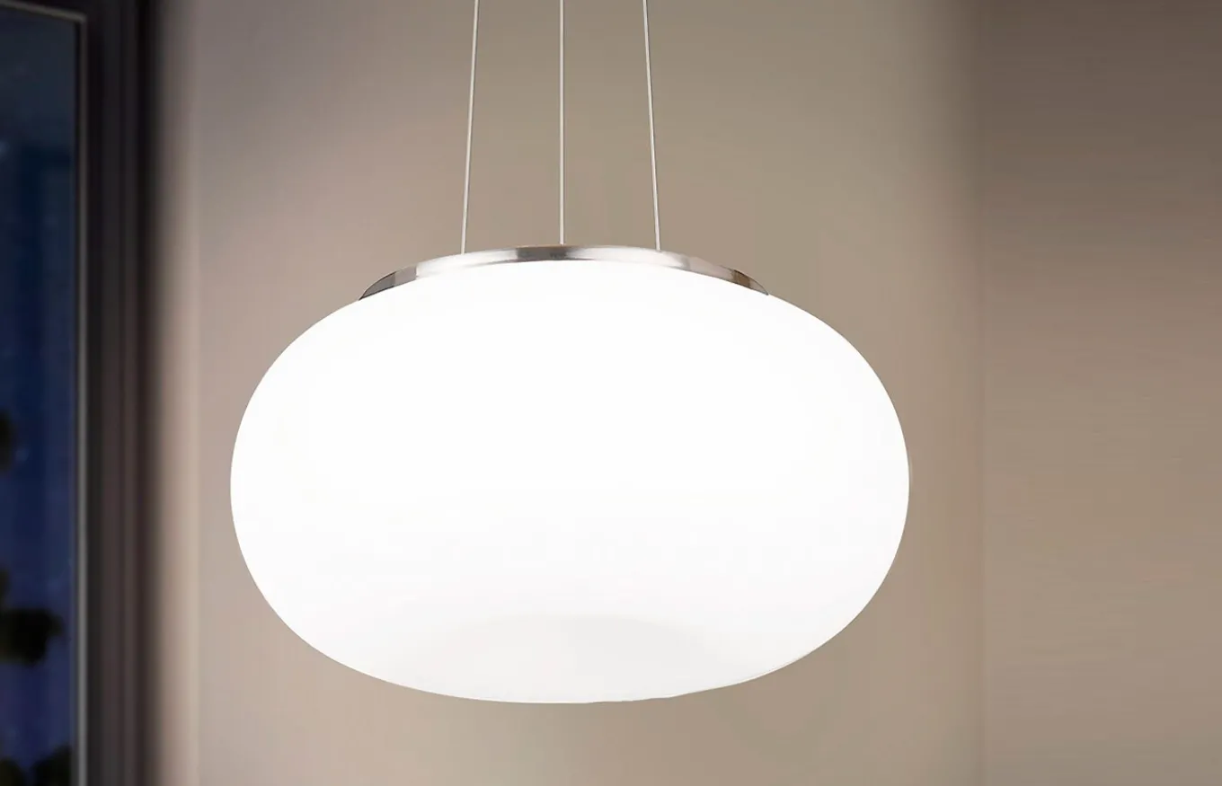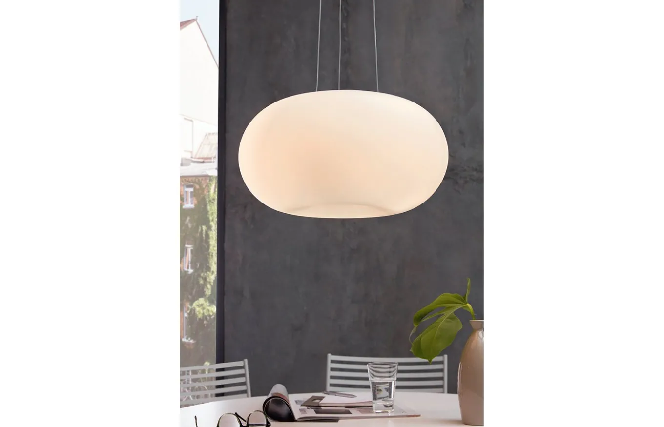 La luminaria colgante Optica está fabricada por una pantalla redonda de cristal opal de formas orgánicas en color blanco, un dosel níquel mate y tres cables metálicos del mismo color. La lámpara colgante se integra a la perfección en ambientes modernos y proporciona una iluminación elegante en el salón o el comedor.