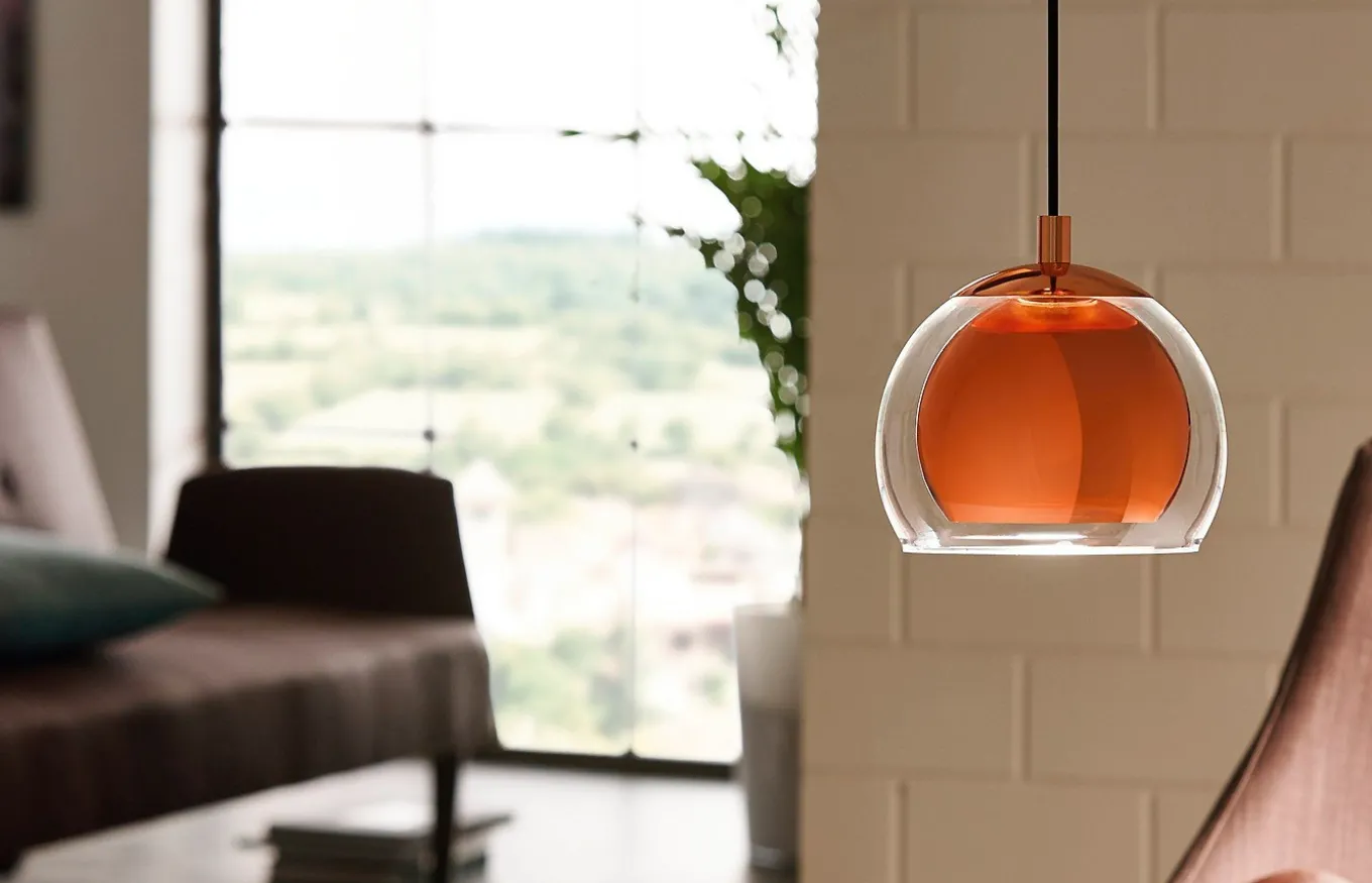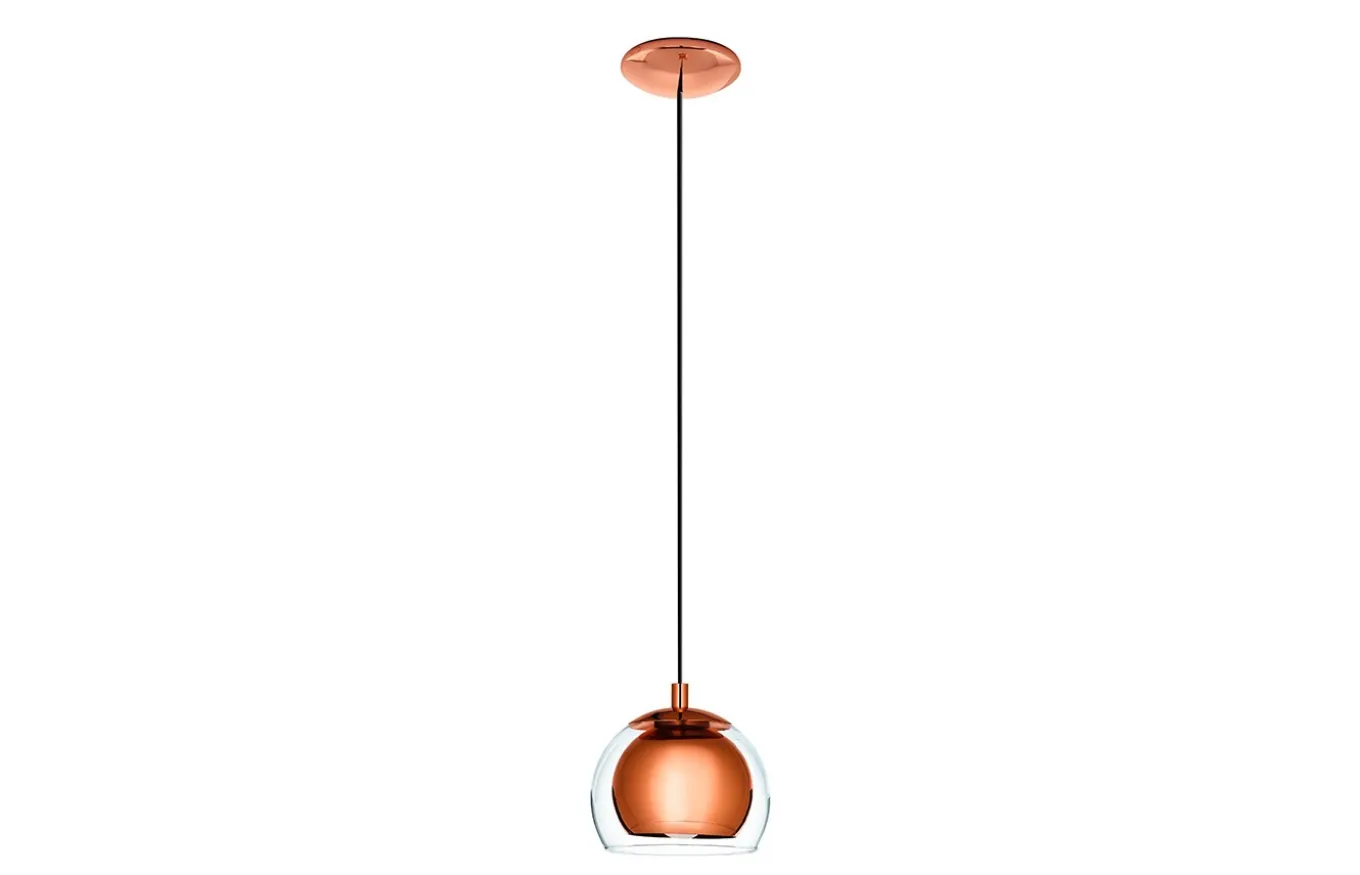 La lámpara colgante Rocamar está fabricada con una pantalla esférica de cristal transparente, que se combina con una pantalla interior de metal en color cobre. La pantalla está suspendida de un dosel redondo de metal color cobre.